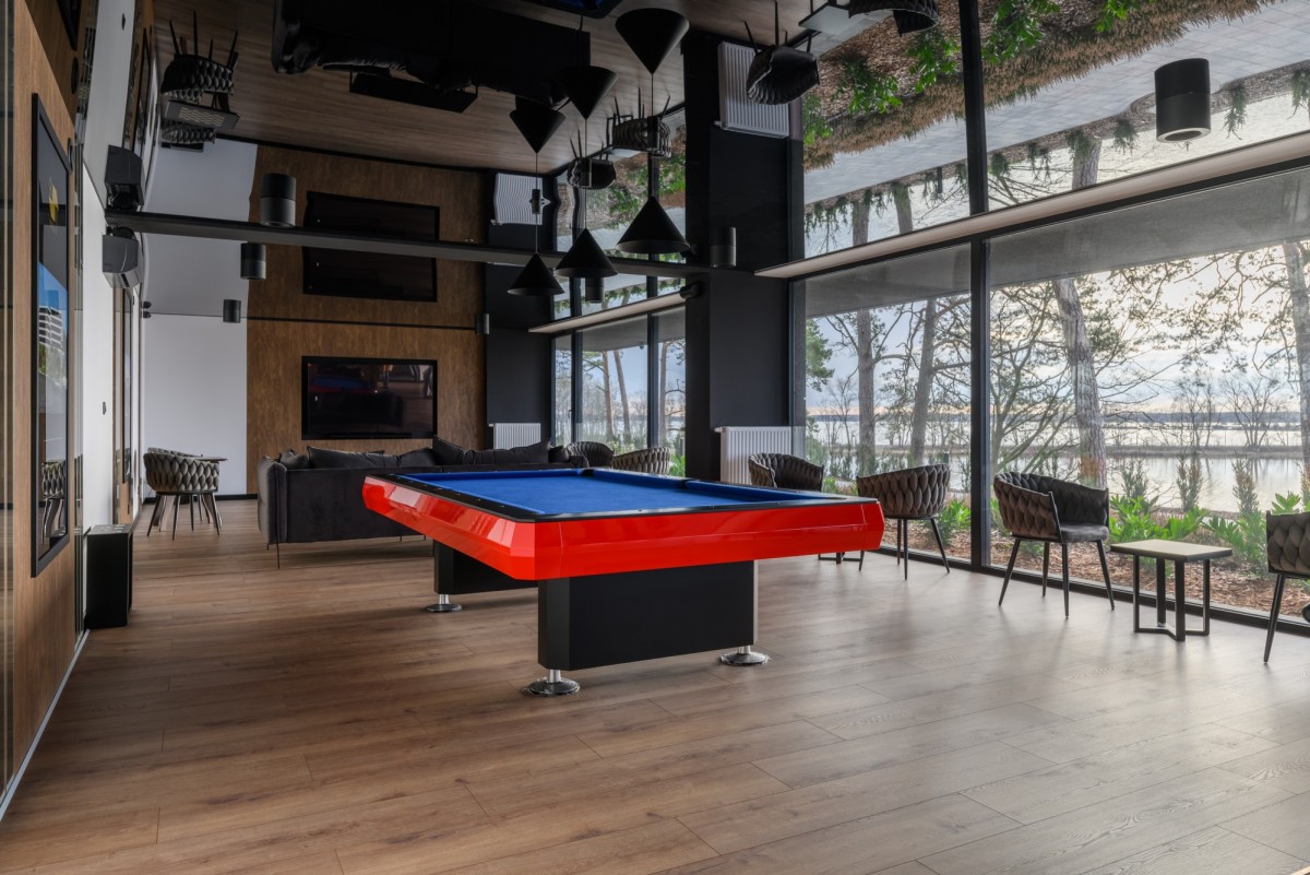 Strefa Rozrywki: Sala klubowa z bilardem, TV i piłkarzykami – idealna na spotkania ze znajomymi w chłodniejsze dni.