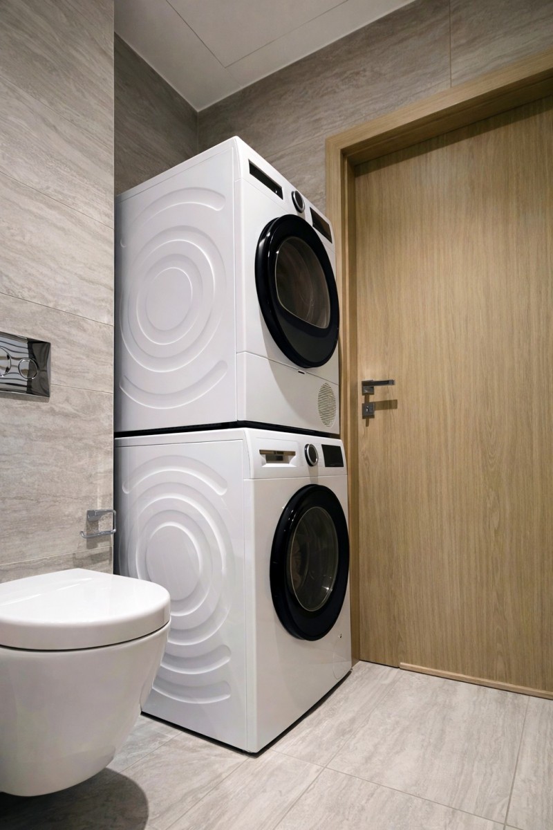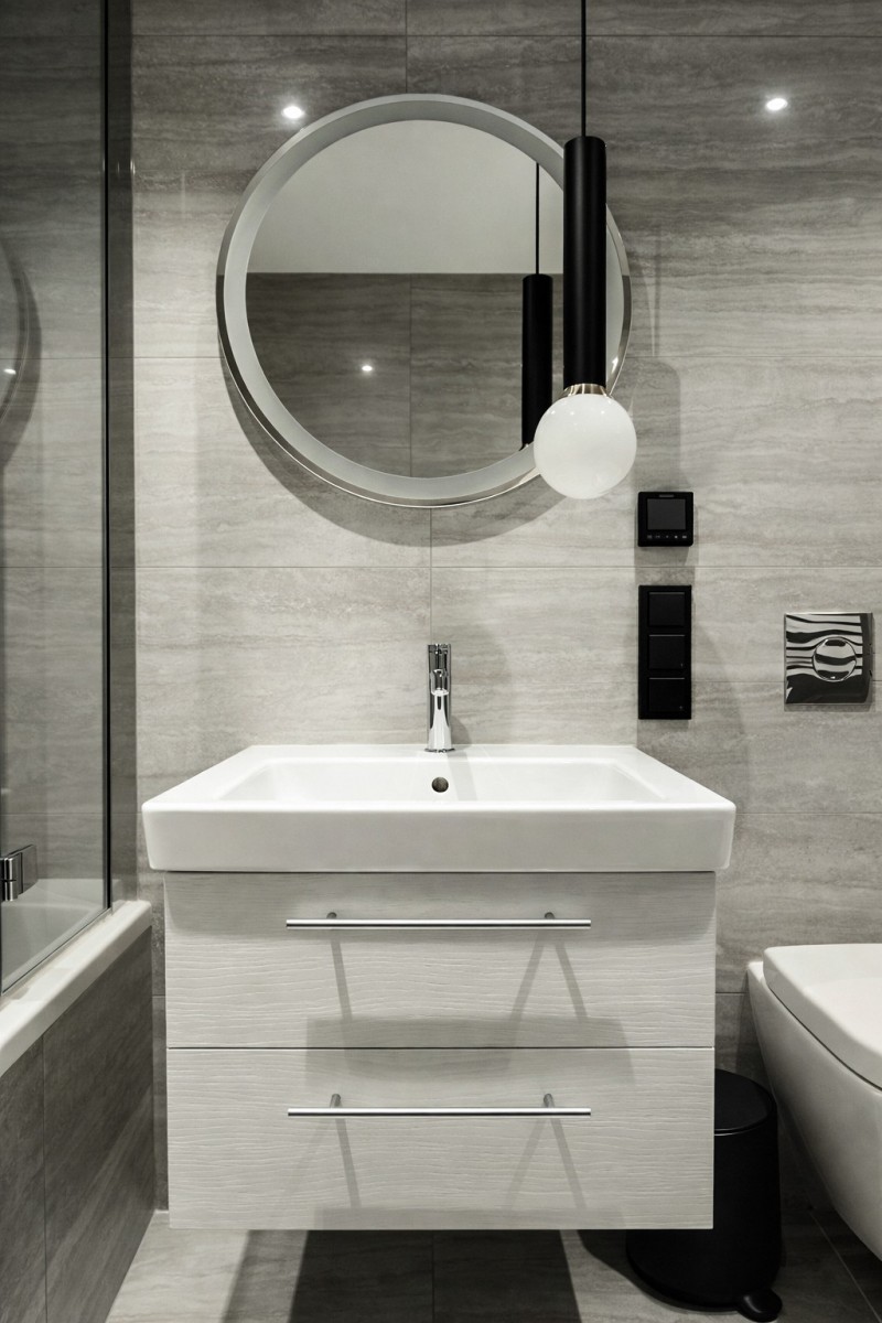 - Elegancka łazienka z wanną akrylową prostokątną 170x70cm z funkcją prysznica, pralką BOSH i suszarką BOSH