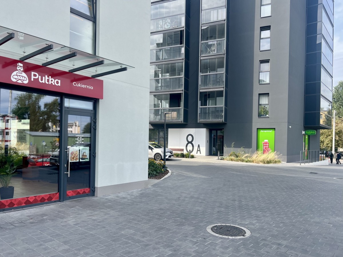 Dwie witryny i dwa wejścia z obu stron budynku: na ulicę Waryńskiego oraz na wewnętrzną stronę osiedla.