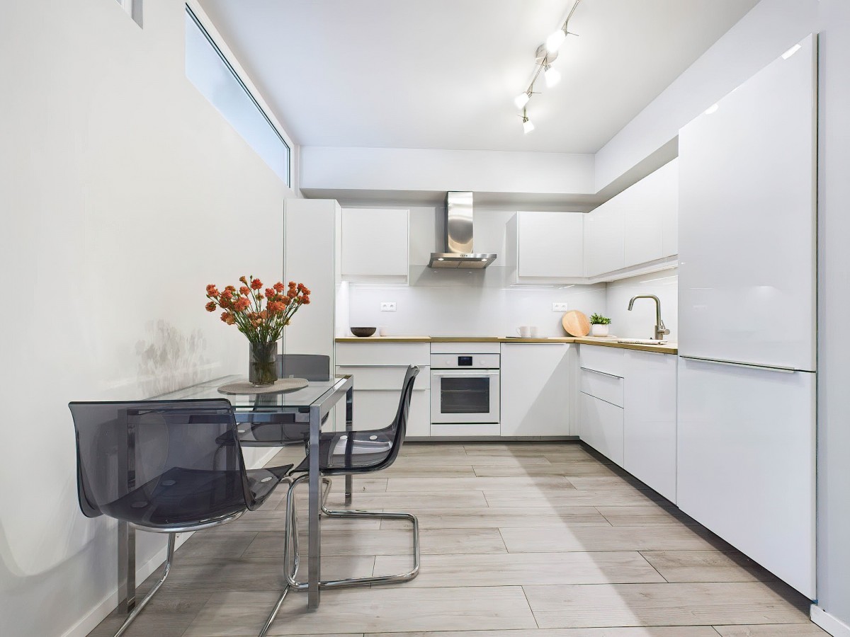 W oddzielnej kuchni wiele pojemnych szafek i urządzenia AGD (lodówka z zamrażarką, płyta indukcyjna, okap, piekarnik i zmywarka).