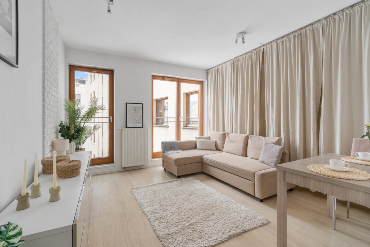 Mieszkanie posiada duże okna sięgające podłogi, zapewniające bardzo dobre doświetlenie i nowoczesny charakter wnętrza. Przemyślany układ sprawia, że lokal jest wyjątkowo funkcjonalny.