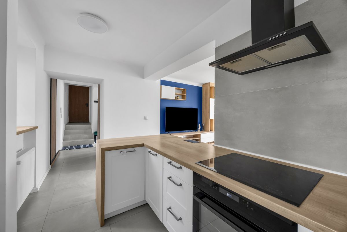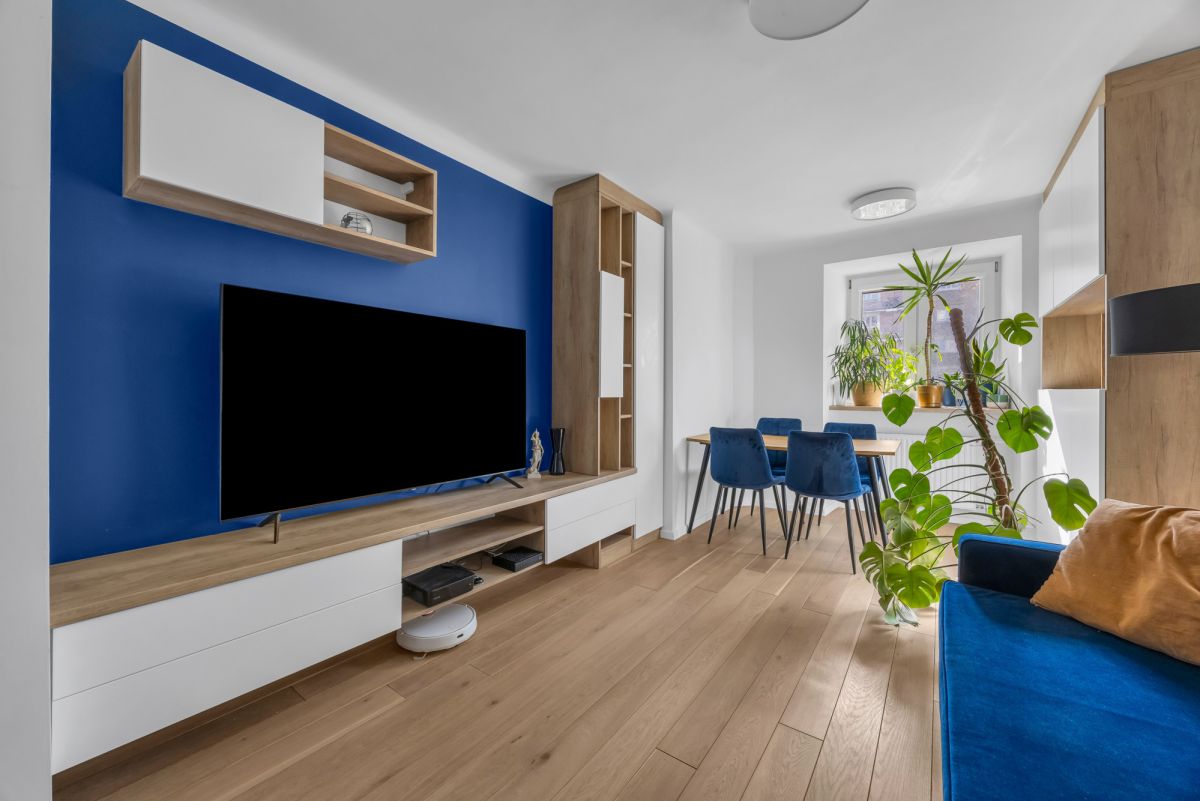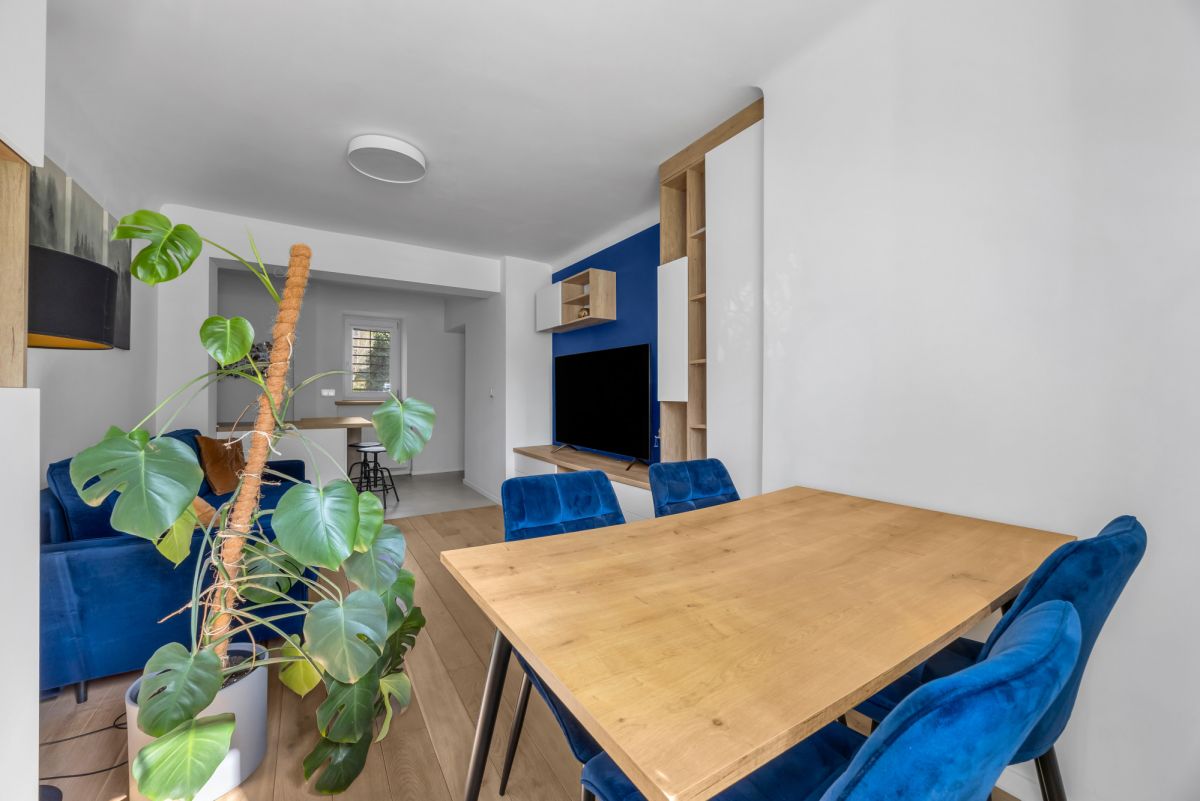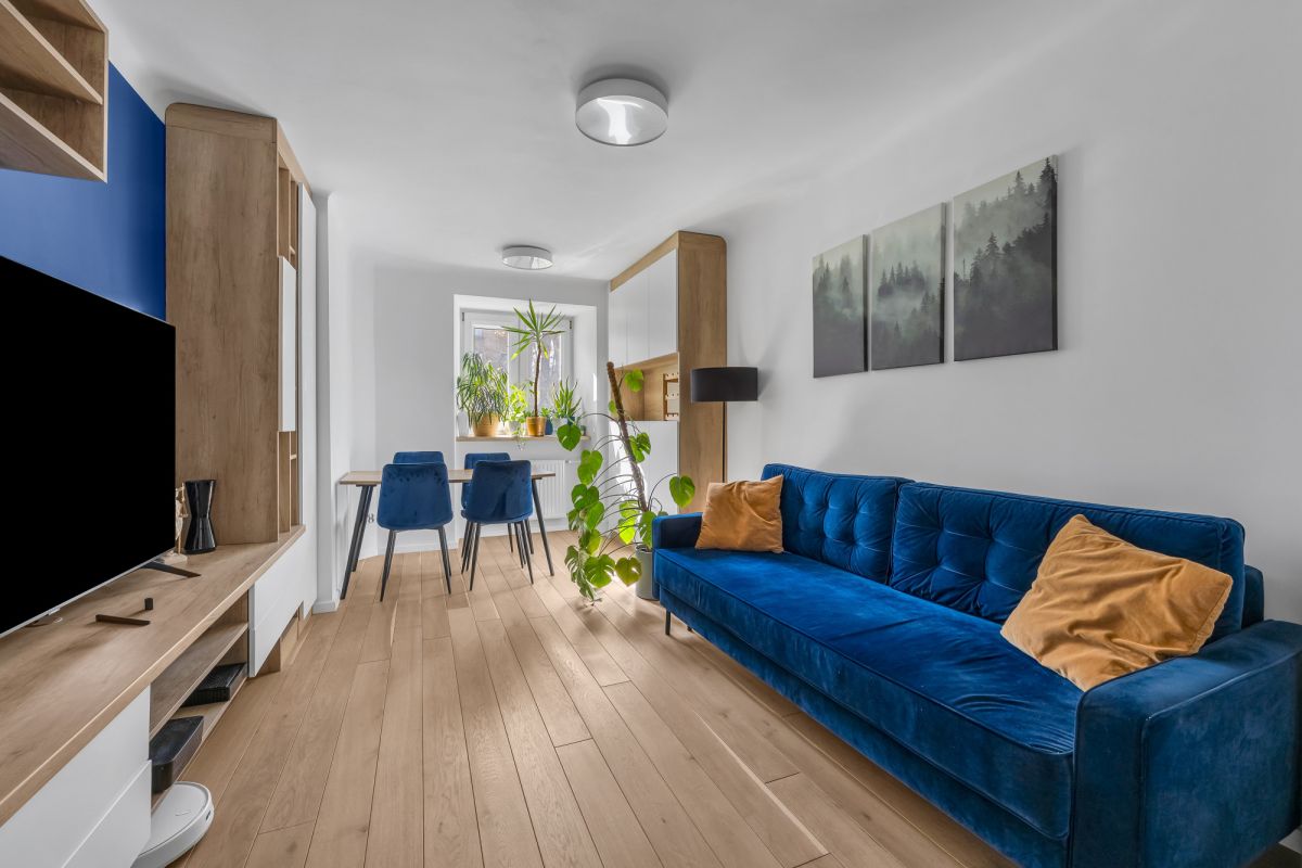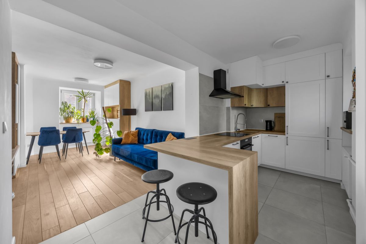 Układ mieszkania obejmuje salon z częścią wypoczynkową, rozkładaną kanapą, stołem z krzesłami, zabudową meblową oraz telewizorem 65 cali. Z salonem połączona jest kuchnia z funkcjonalnie wydzieloną strefą roboczą oraz wyspą z miejscem do siedzenia na hokerach. Jest w pełni wyposażona w lodówkę, zmywarkę, piekarnik, płytę grzewczą oraz podstawowe wyposażenie kuchenne.