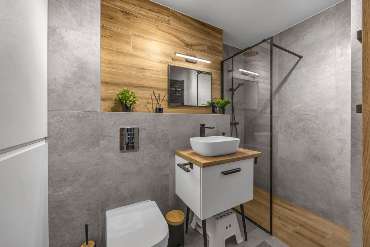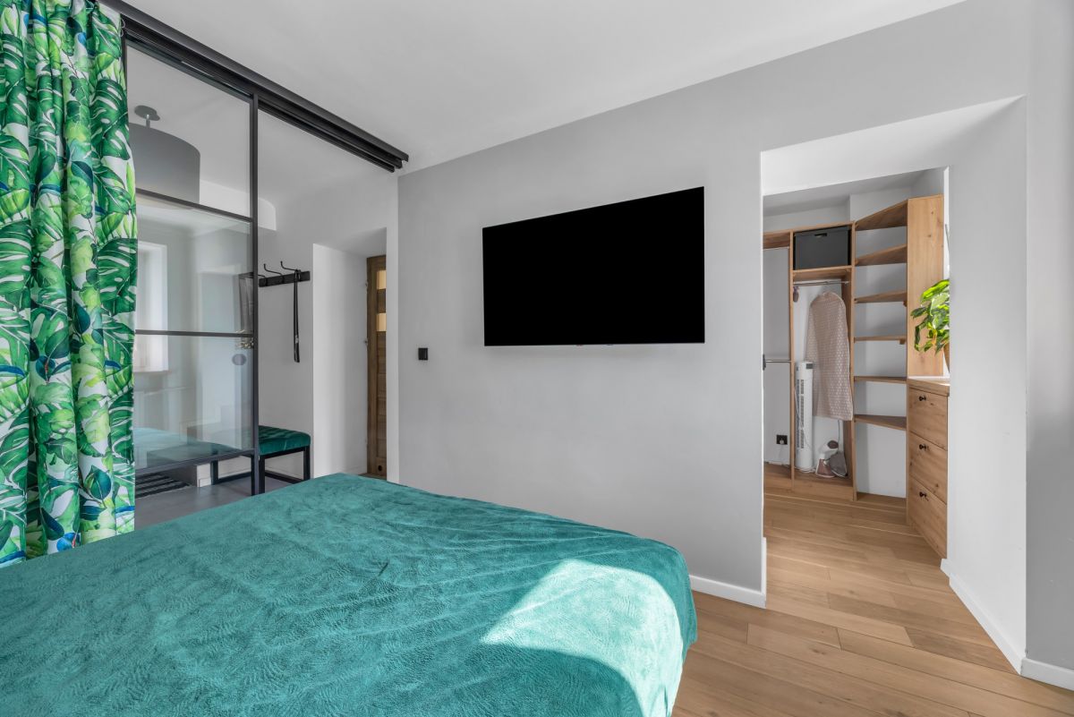 W sypialni znajduje się łóżko dwuosobowe i bezpośrednie przejście do przestronnej garderoby z zabudową do sufitu i oknem, co zapewnia wygodną i dobrze zorganizowaną przestrzeń. W przedpokoju znajdują się szafy wnękowe oraz pojemna zabudowa, która daje dużo miejsca do przechowywania. Łazienka wyposażona jest w duży prysznic typu walk-in oraz zabudowę z miejscem na pralkę i dodatkowe przechowywanie.