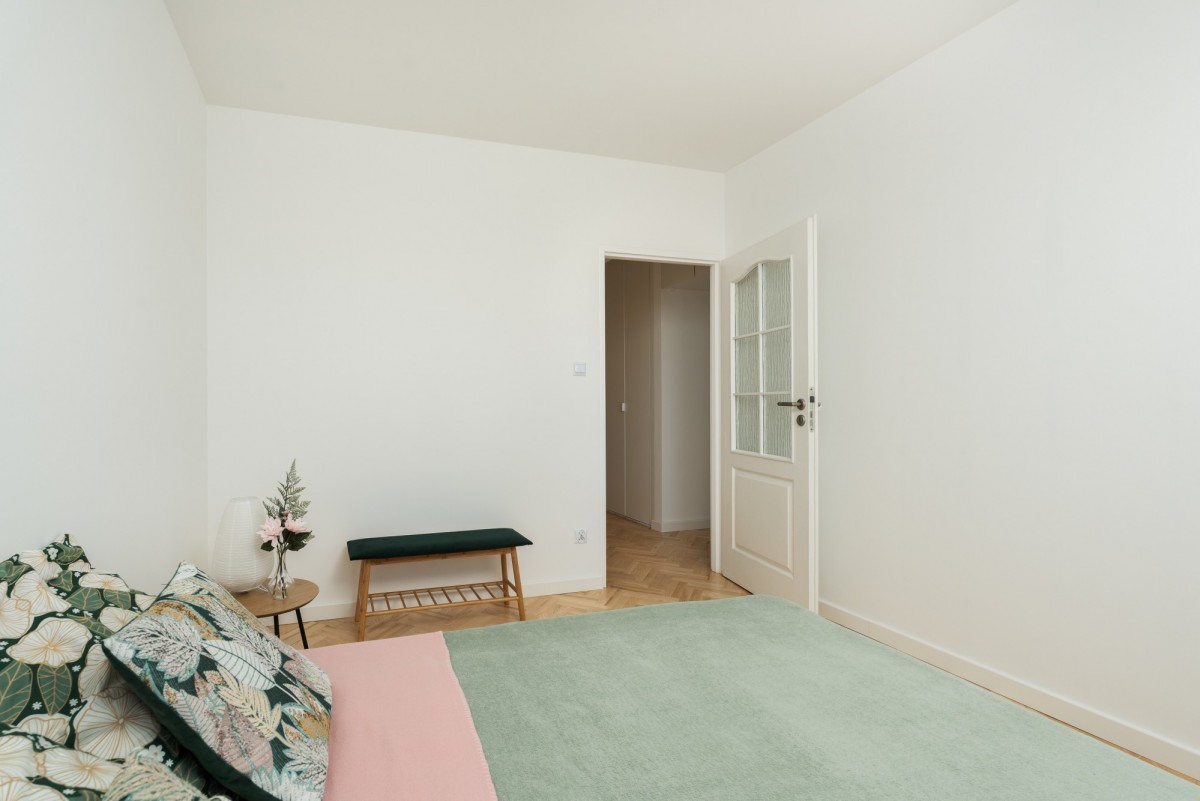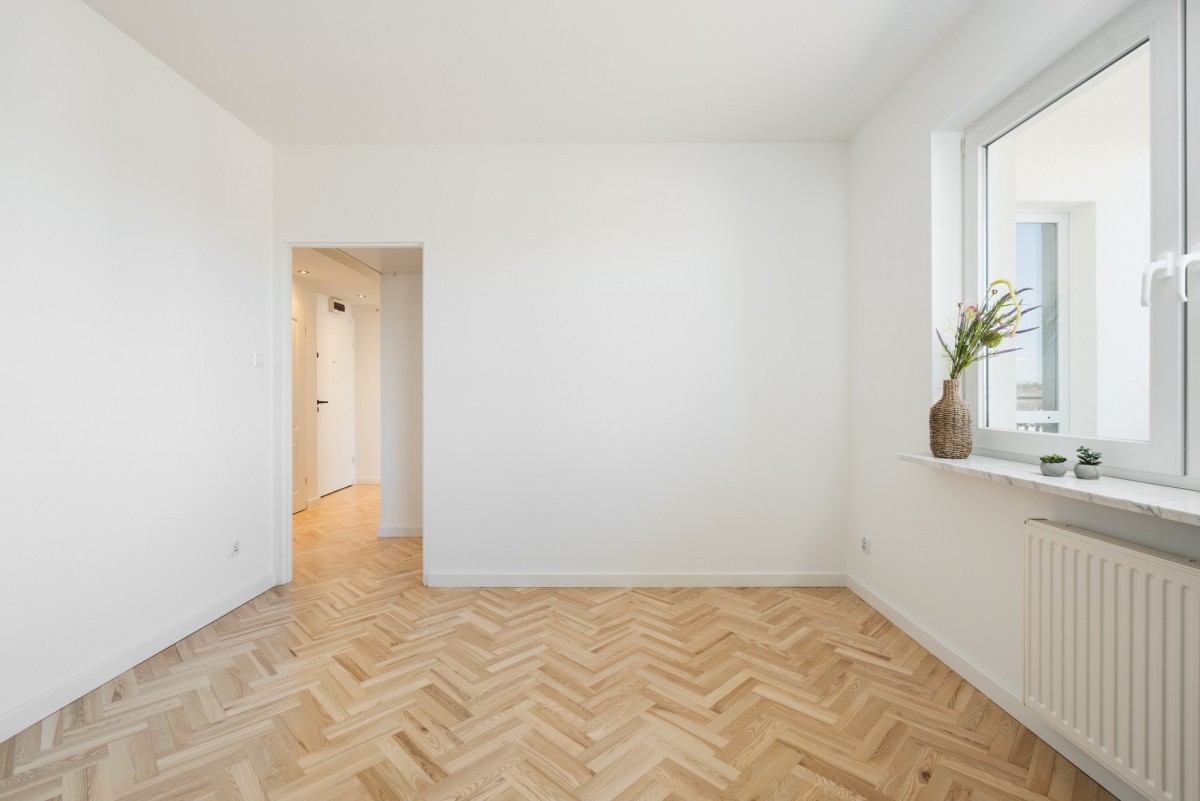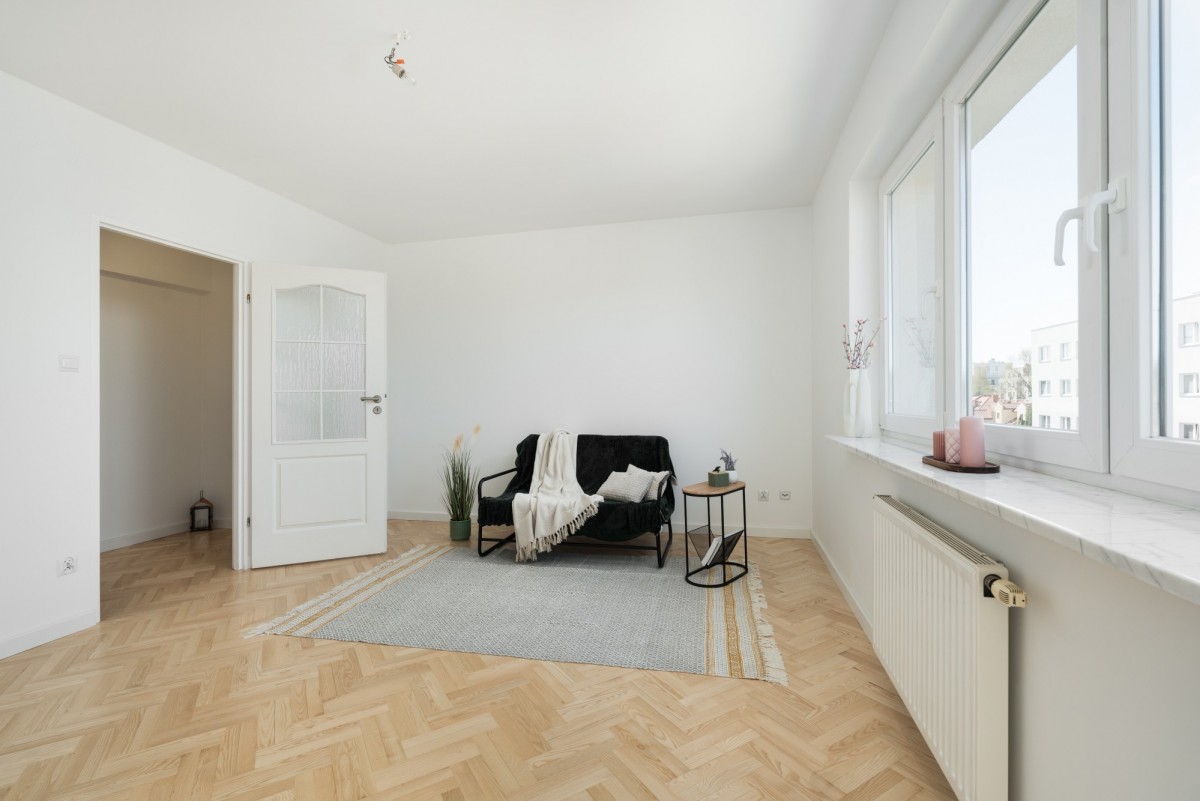 Lokal jest cichy i słoneczny, na podłogach odświeżony drewniany parkiet ułożony w jodełkę. Ekspozycja okien zachodnia.
