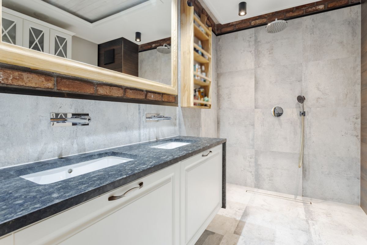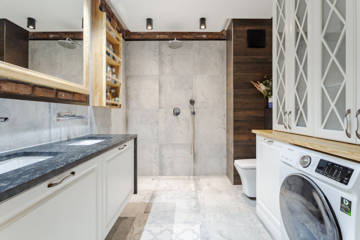Łazienka – nowoczesna, wyposażona w wannę z nowym szklanym parawanem, pralkę, umywalkę i WC.