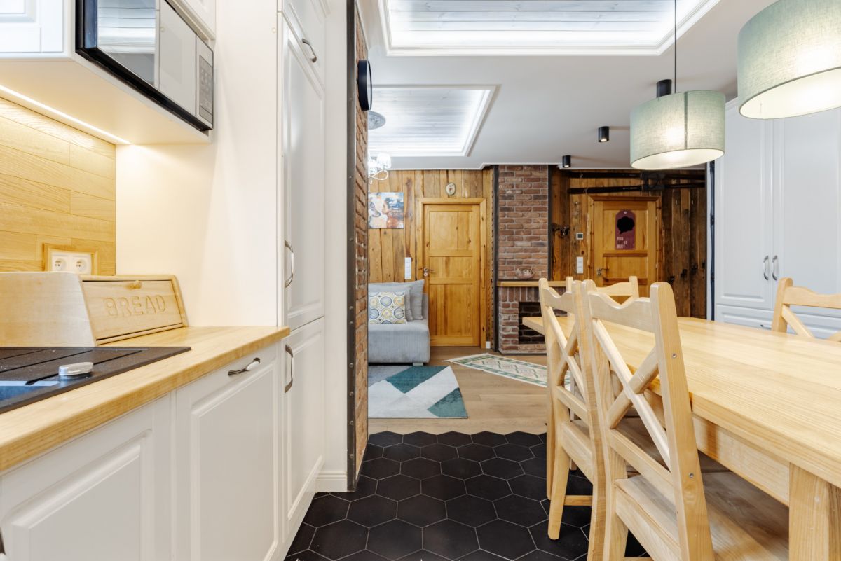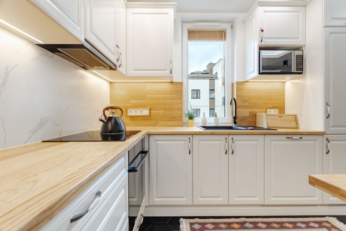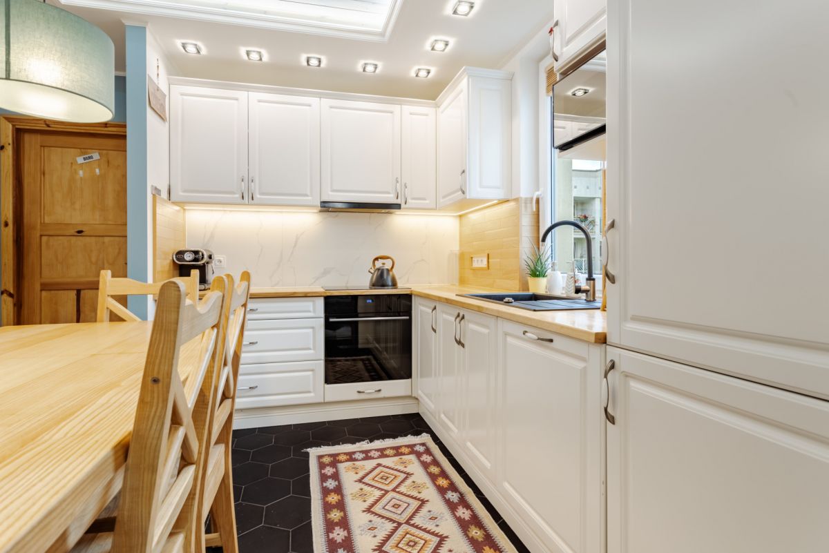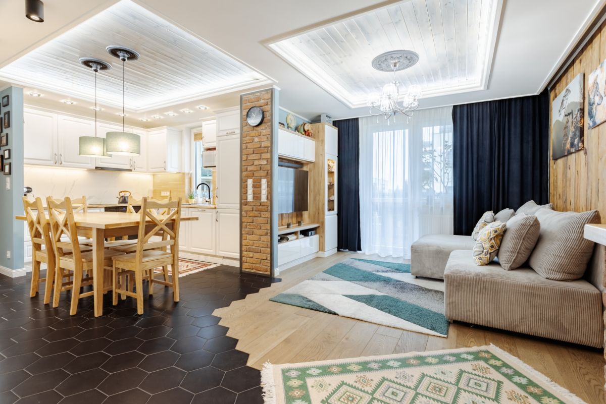 Salon z aneksem kuchennym – przestronny i jasny, z wygodną przestrzenią do wypoczynku i wyjściem na balkon. Aneks wyposażony w nowoczesne sprzęty AGD: piekarnik, płytę indukcyjną, lodówko-zamrażarkę, zmywarkę oraz praktyczną przesuwną wyspę, która świetnie sprawdza się zarówno jako dodatkowy blat, jak i miejsce do wspólnych posiłków.
