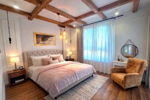 Sypialnia z łóżkiem małżeńskim, szafą w zabudowie, dużym oknem