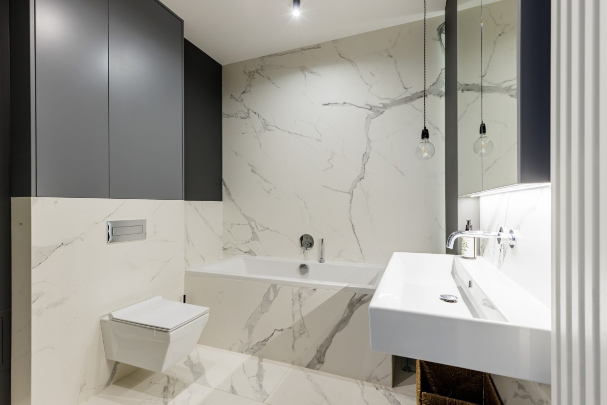 Dwie duże i eleganckie łazienki, jedna z prysznicem, druga z wanną i prysznicem, dla pełnej wygody.