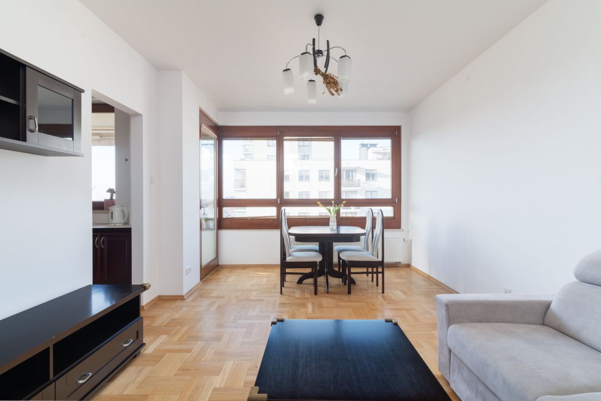 Salon: Jasny i przestronny, z wyjściem na balkon oraz bezpośrednim dostępem do kuchni.