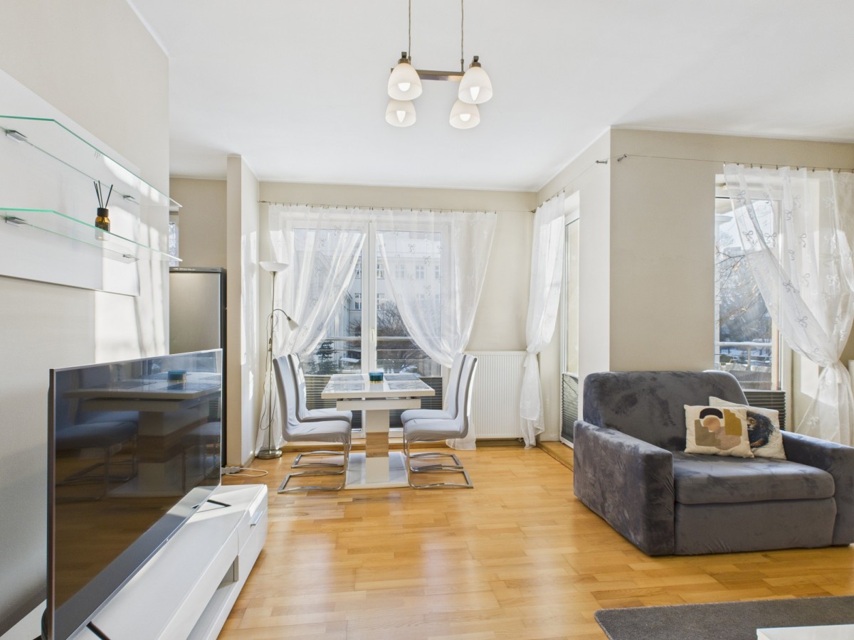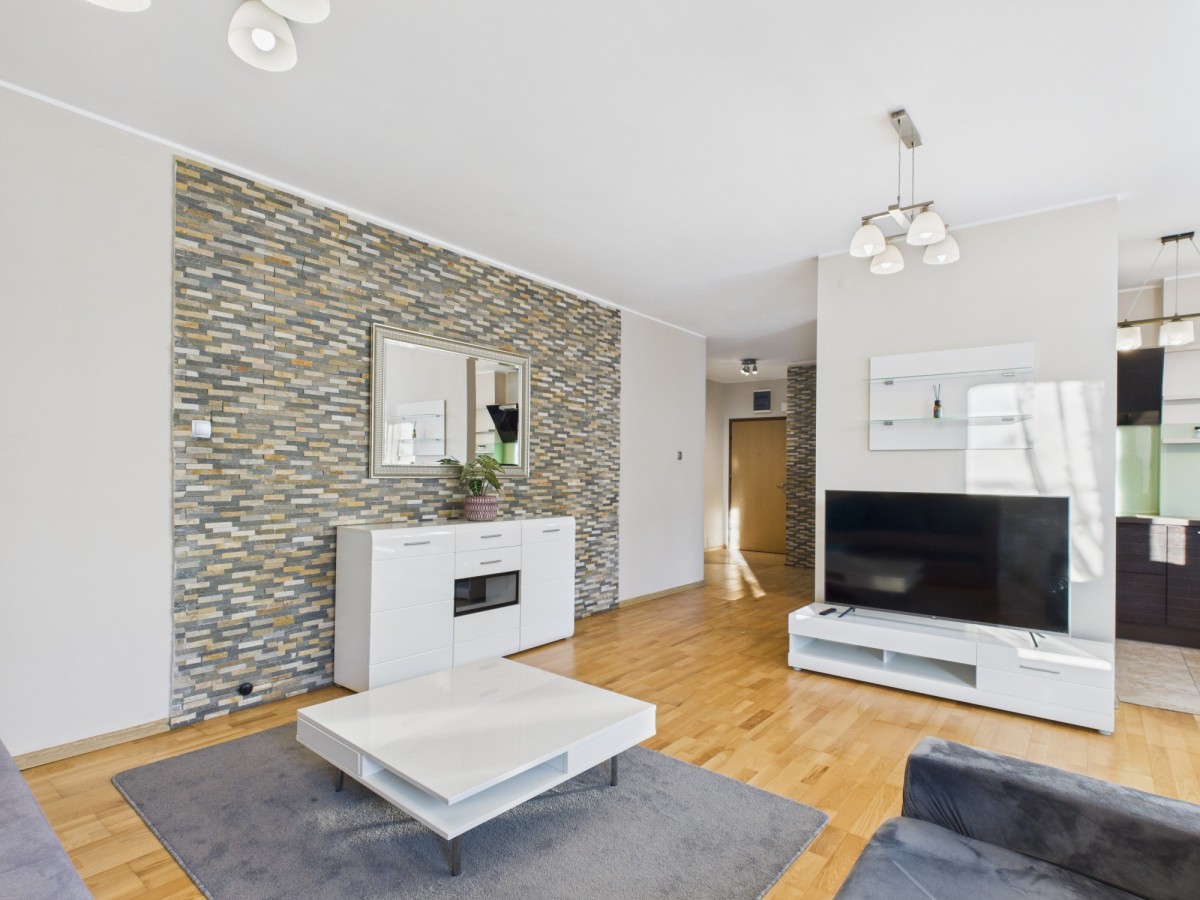 przestronny salon połączony z kuchnią i jadalnią z wyjściem na balkon;