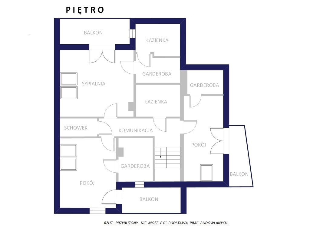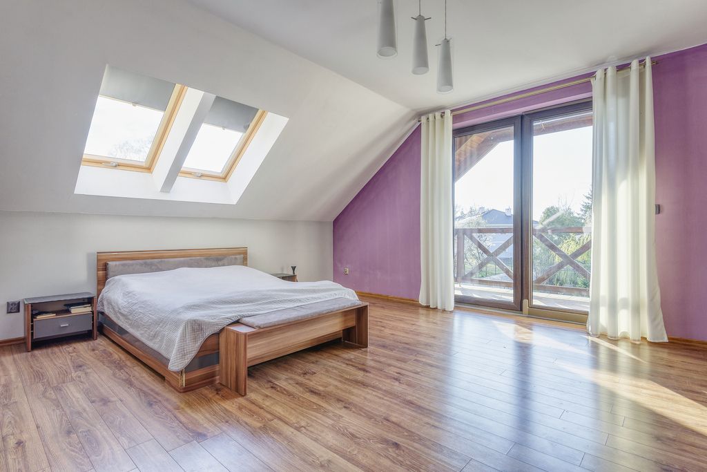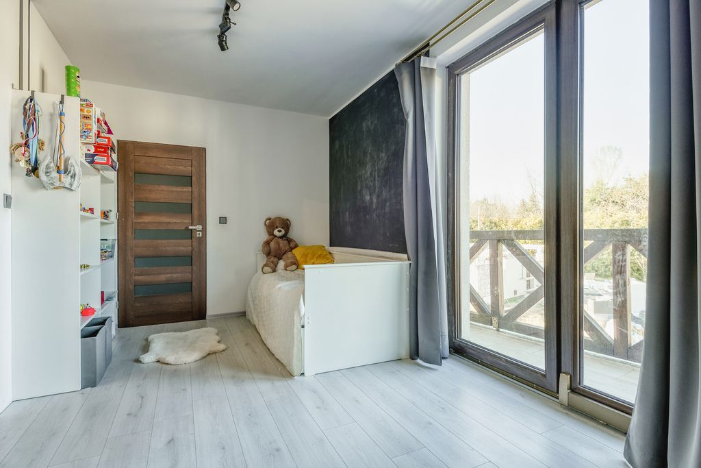 Główna sypialnia wyróżnia się przestronnością oraz bezpośrednim dostępem do prywatnej łazienki – przygotowanej instalacyjnie, pozostającej do indywidualnego wykończenia. Na tej kondygnacji znajduje się także druga, w pełni wykończona łazienka oraz dodatkowy schowek.