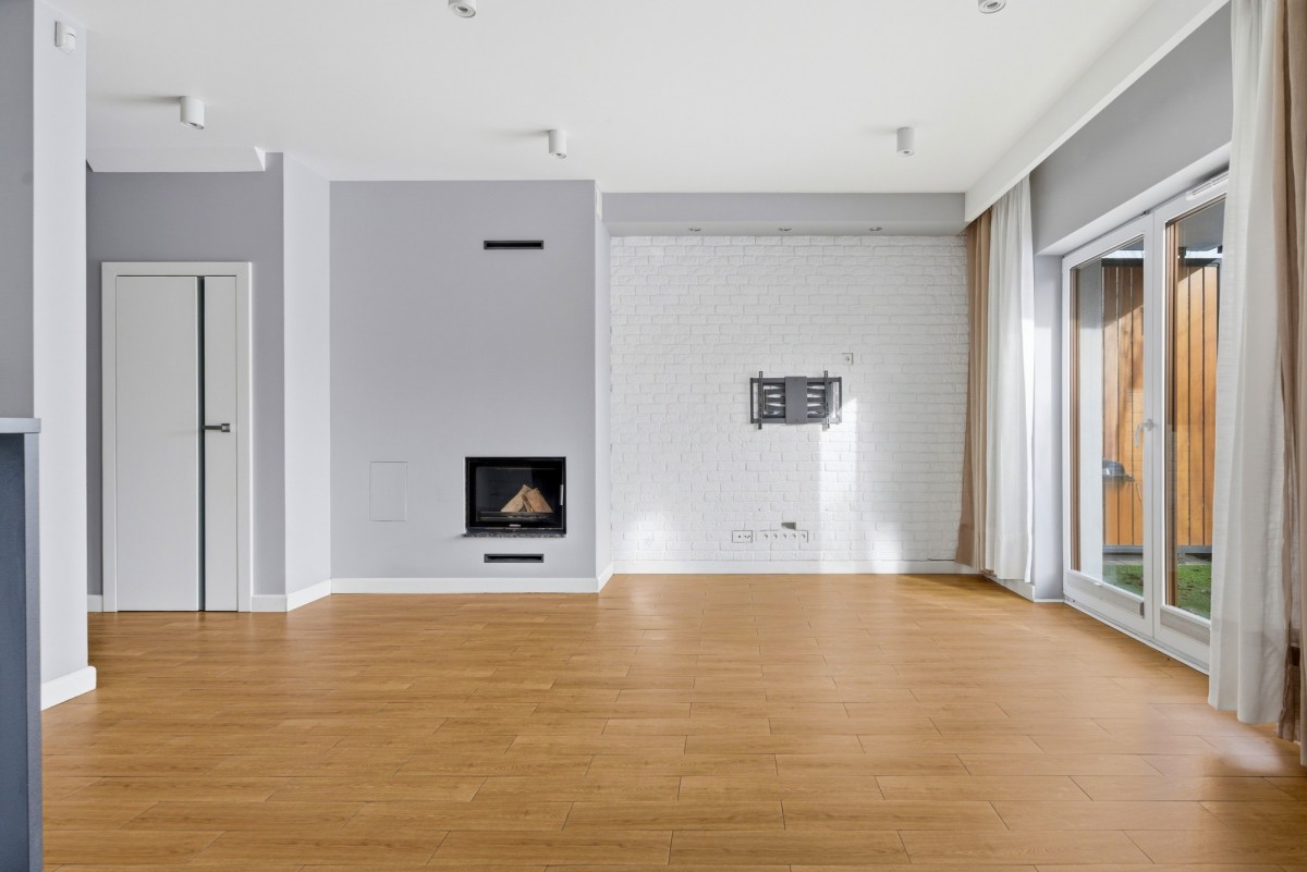 – salon z kominkiem i wyjściem do prywatnego ogródka – idealne miejsce na kawę czy spotkania z bliskimi