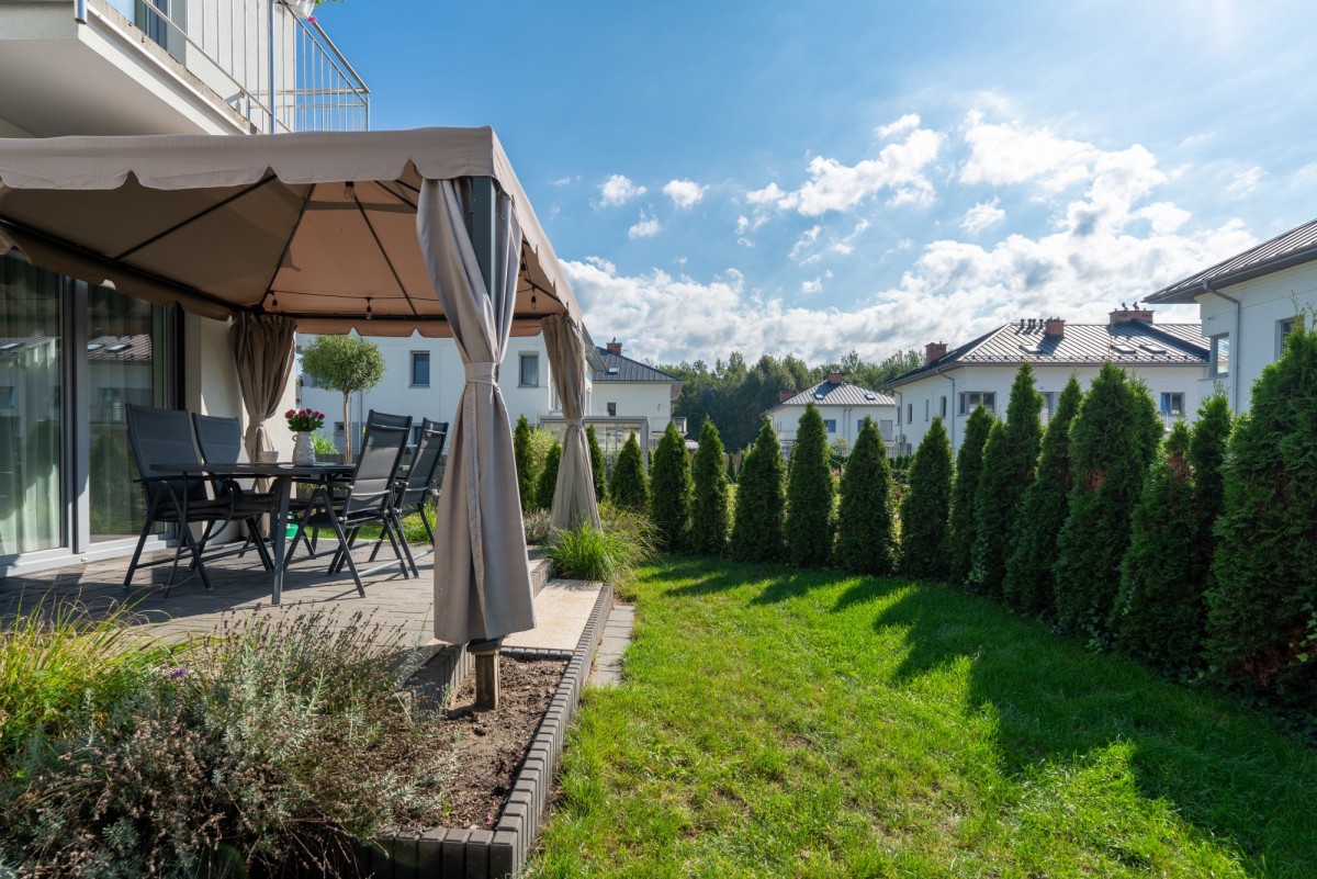 Duży, zielony ogród z tarasem to idealne miejsce na poranną kawę, relaks po pracy, rodzinne posiłki na świeżym powietrzu czy spotkania towarzyskie.