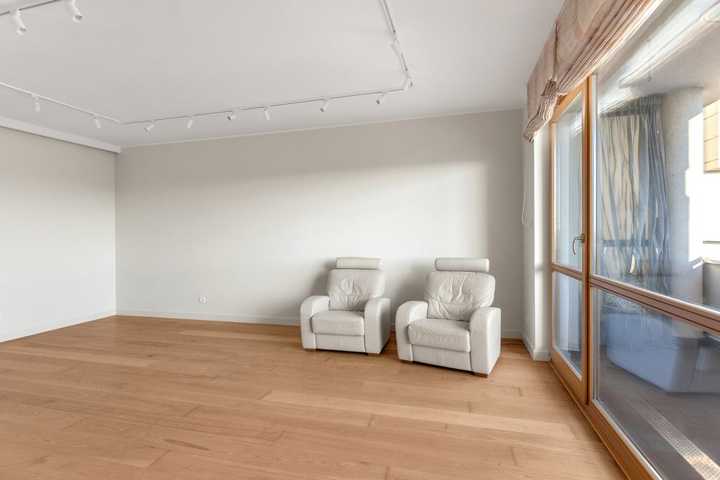 The apartment itself, located on the 8th floor, offers a stunning view of the skyscrapers of central Warsaw. The terrace is large and features comfortable patio furniture.