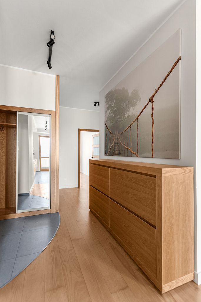 The interiors are spacious and warm. Solid ash floors, light walls, and a functional and fully equipped kitchen. The living room offers plenty of space for a table, a large sofa, and armchairs.