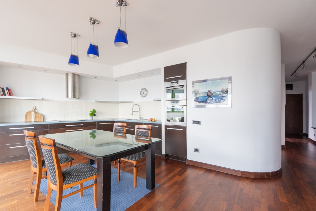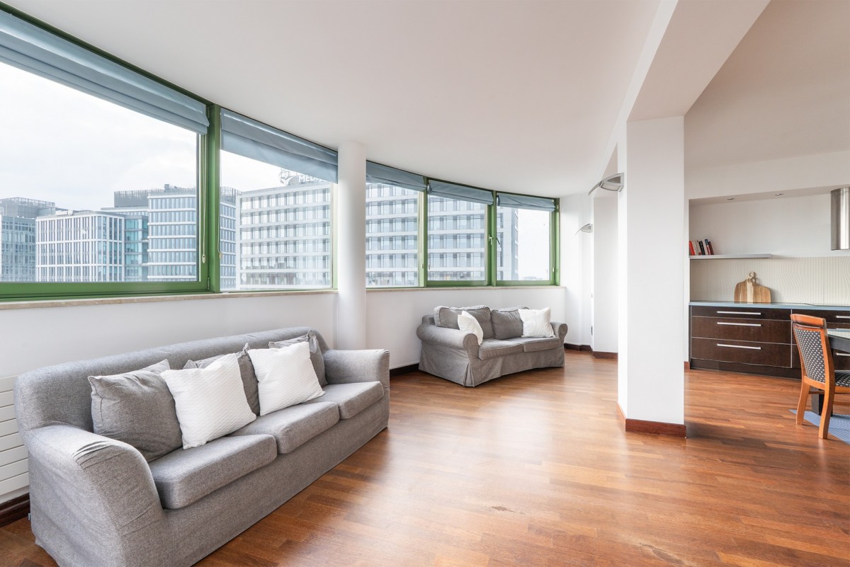 Apartament zajmuje 102,2 m² starannie zaprojektowanej przestrzeni w budynku z 2004 roku, zaprojektowanym przez renomowaną pracownię APAR Projekt Tadeusz Szumielewicz i Partnerzy. Budynek liczy 17 pięter i wyposażony jest w dwie windy, z których jedna zawsze czeka na parterze. Całodobowa ochrona zapewnia bezpieczeństwo i komfort przez okrągłą dobę.