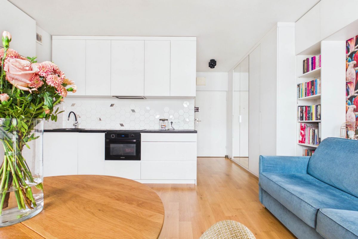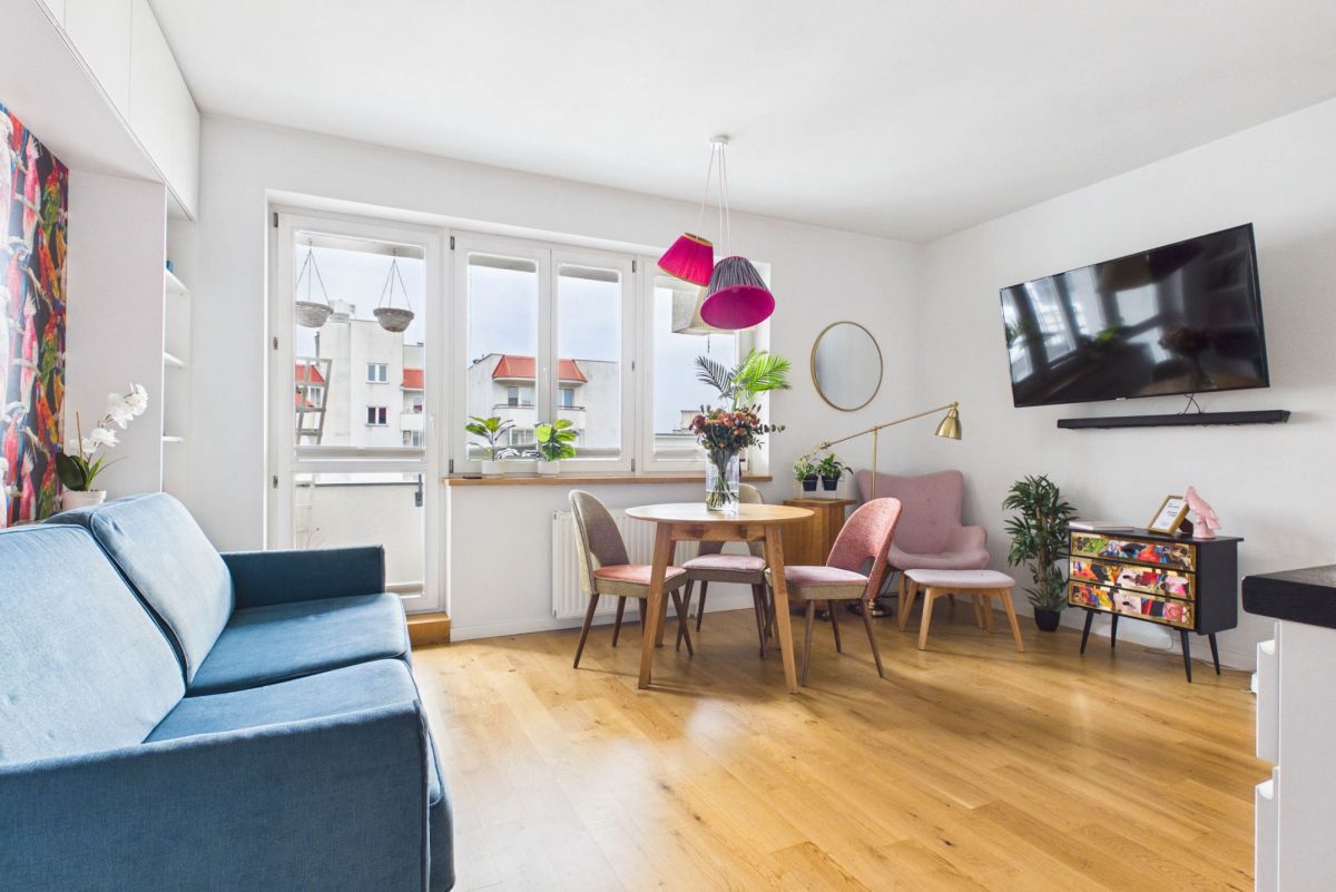 Na sprzedaż przytulna i funkcjonalnie urządzona kawalerka o powierzchni 27 m², położona przy ulicy Odkrytej 48B w Warszawie, w zielonej i spokojnej części Białołęki – Nowodworach.