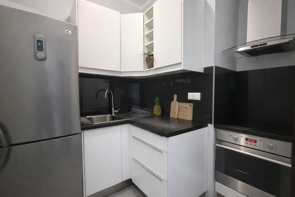 Kuchnia wyposażona w: meble w zabudowie, lodówkę, płytę indukcyjną, piekarnik, okap.