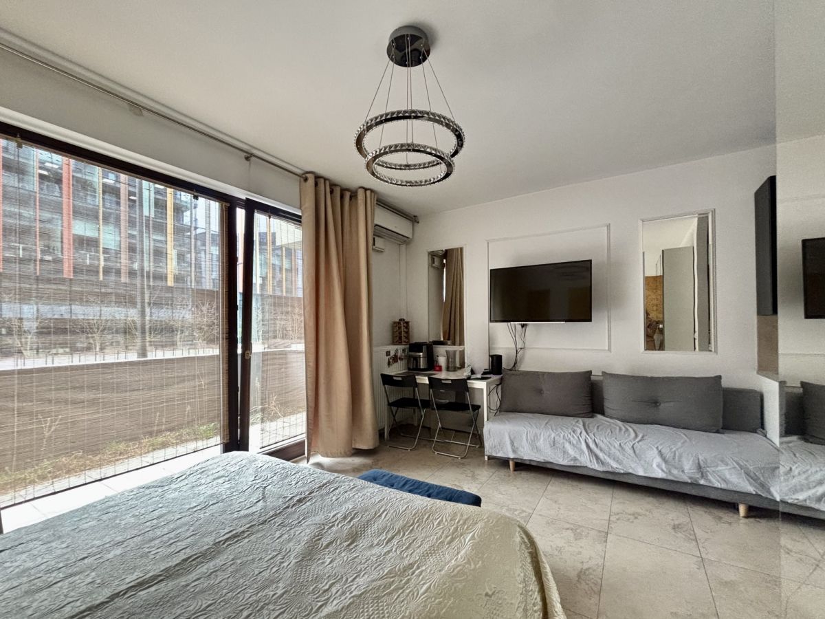 Duże, panoramiczne okno zapewnia doskonałe doświetlenie wnętrza przez cały dzień. W skład mieszkania wchodzi również łazienka z kabiną prysznicową.