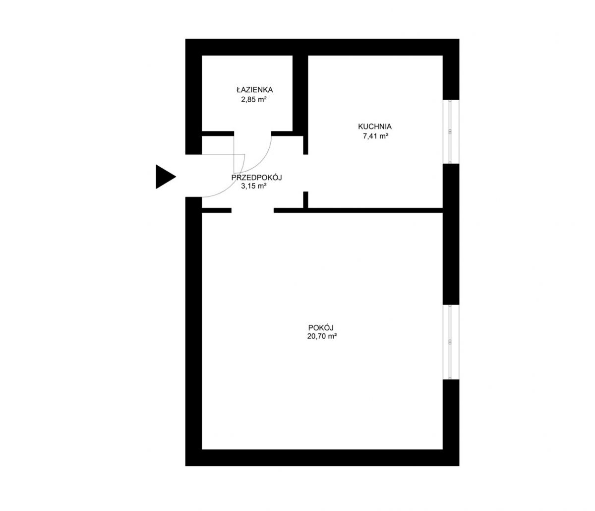 Funkcjonalny układ – pokój, kuchnia, łazienka, przedpokój oraz duża piwnica (8 m²) zapewniają wygodną przestrzeń do życia.