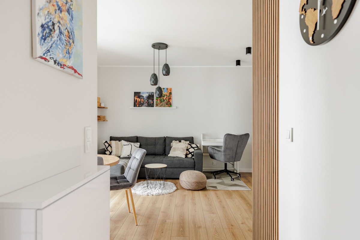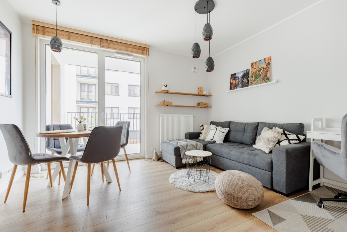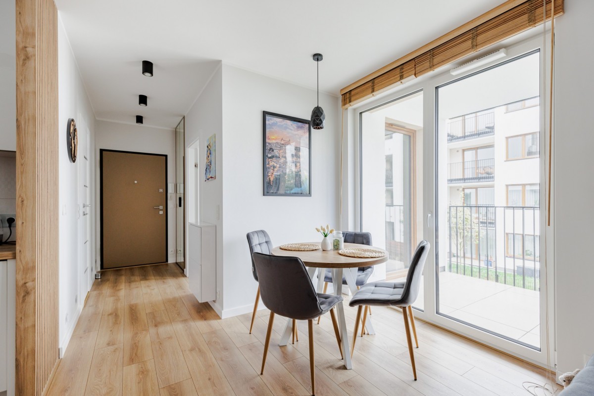 - jasnego salonu z aneksem kuchennym oraz wyjściem na balkon