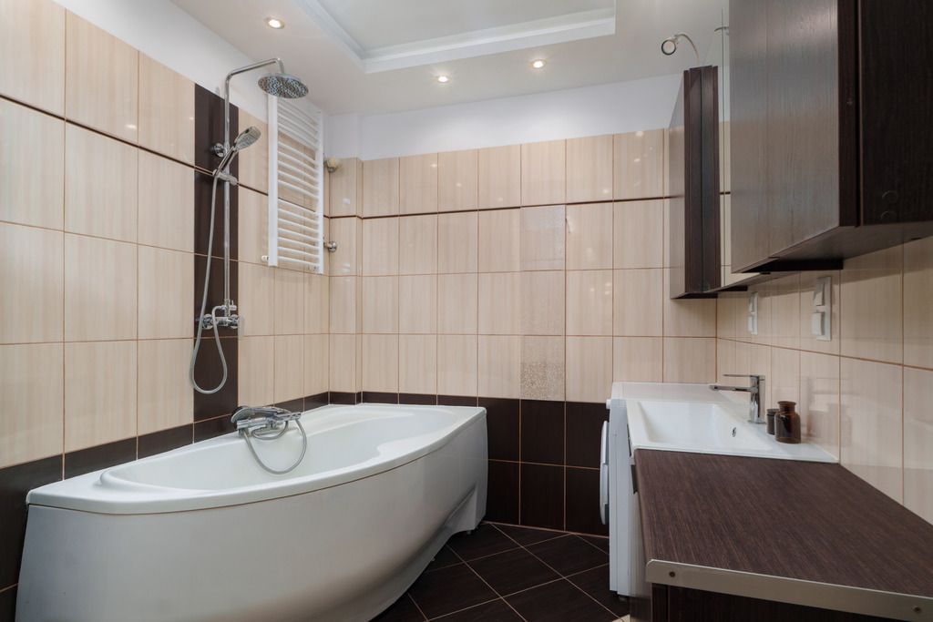 funkcjonalna – wyposażona w dużą wannę z deszczownicą, pralkę oraz pojemne szafki. Dzięki zabudowie z blatem łazienka jest nie tylko estetyczna, ale i bardzo praktyczna – zapewnia wygodne przechowywanie i komfort codziennego użytkowania