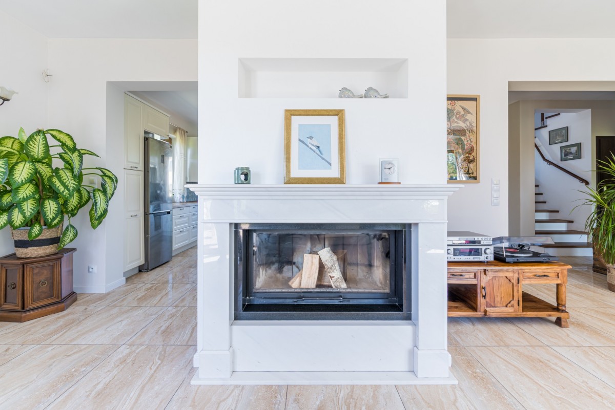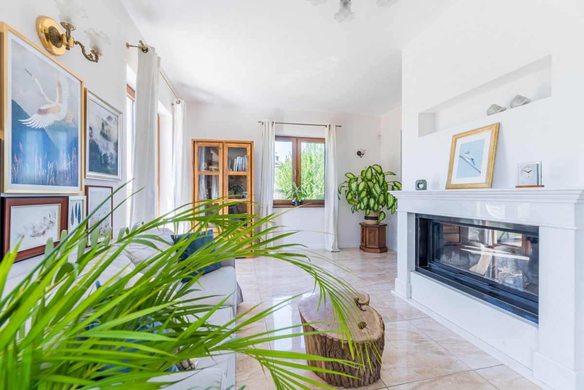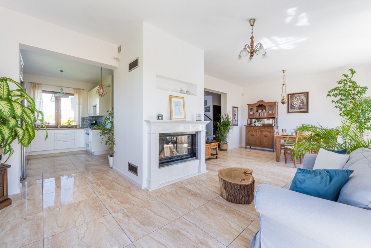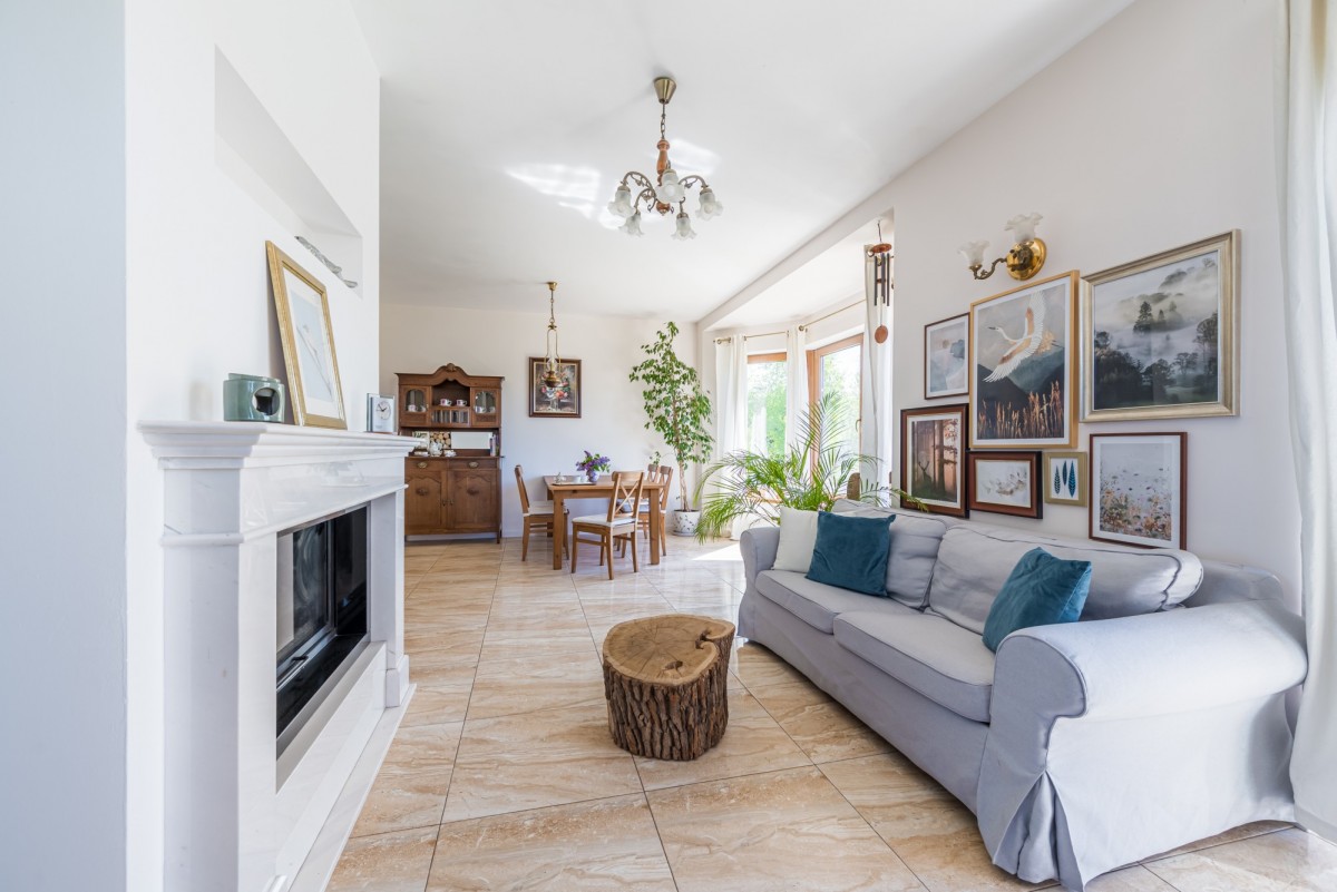 pokój dzienny o powierzchni 32,82 m2 z pięknym kominkiem, połączony z jadalnią z wyjściem na taras
