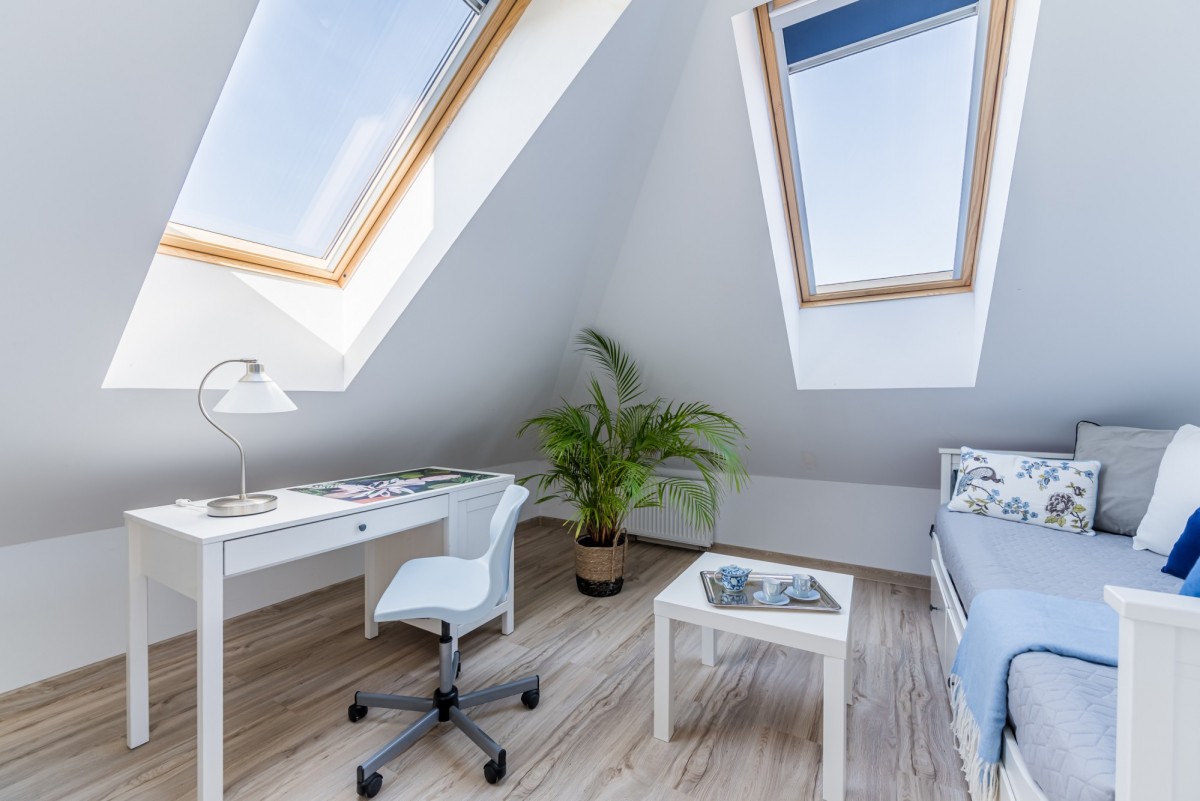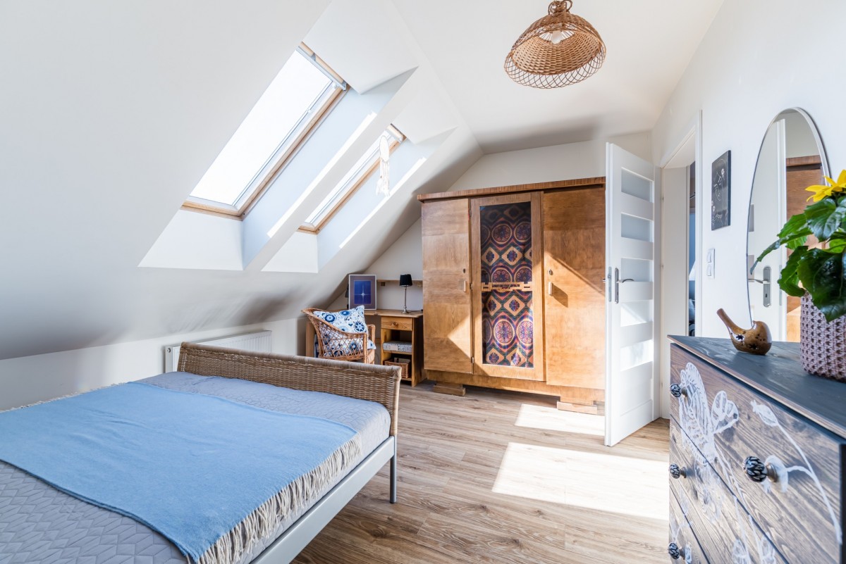 Okna PCV z okleiną w kolorze drewna oraz połaciowe drewniane z zamontowanymi roletami.