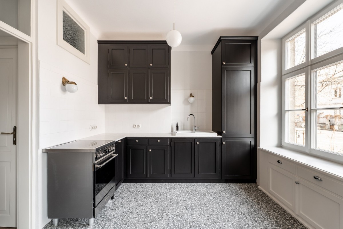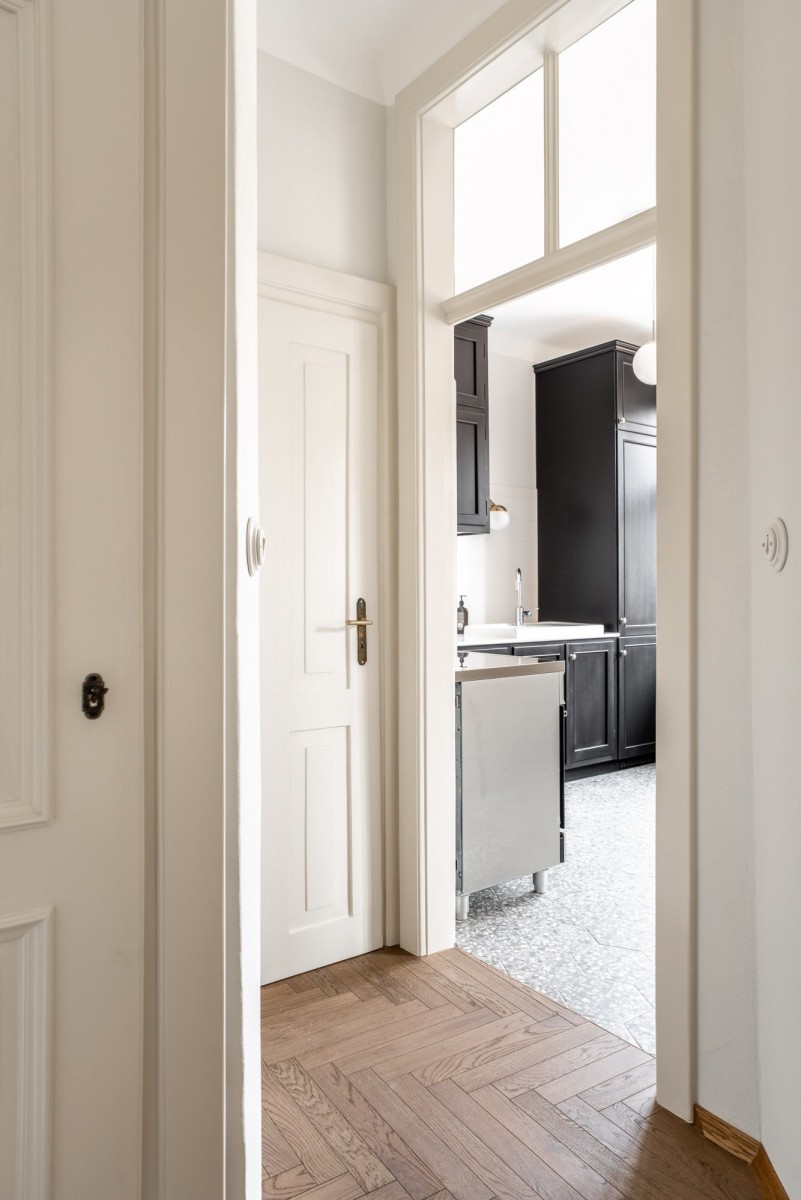 Mieszkanie zostało odrestaurowane z najwyższym szacunkiem do historycznego charakteru kamienicy, łącząc przedwojenną elegancję z nowoczesnymi rozwiązaniami.