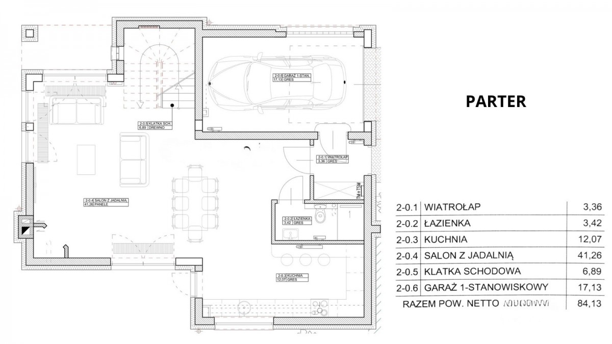 Parter (84,13 m2): Serce domu stanowi przestronny salon z jadalnią i otwartą kuchnią, z którego prowadzi bezpośrednie wyjście na ogród. Na tej kondygnacji znajduje się również wiatrołap, łazienka oraz jednostanowiskowy garaż.
