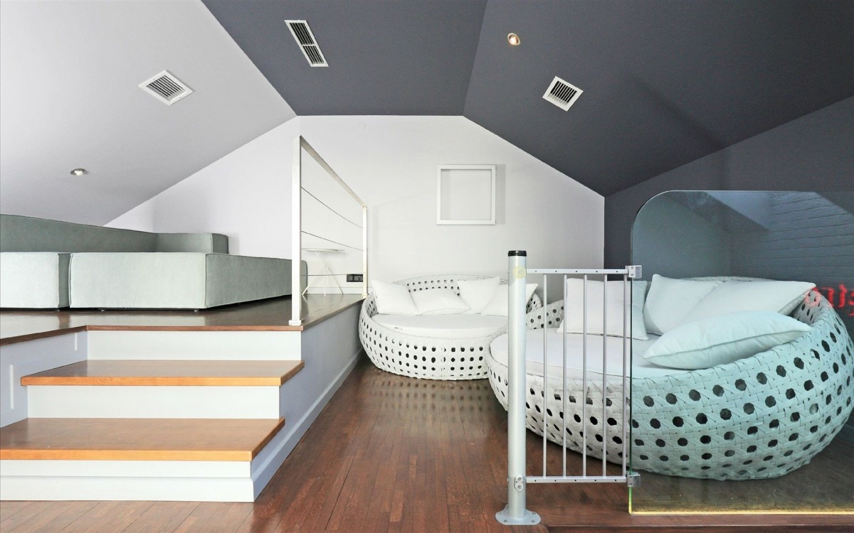 The top floor offers a relaxing space with an open space, bar, terrace, an office and bathroom.