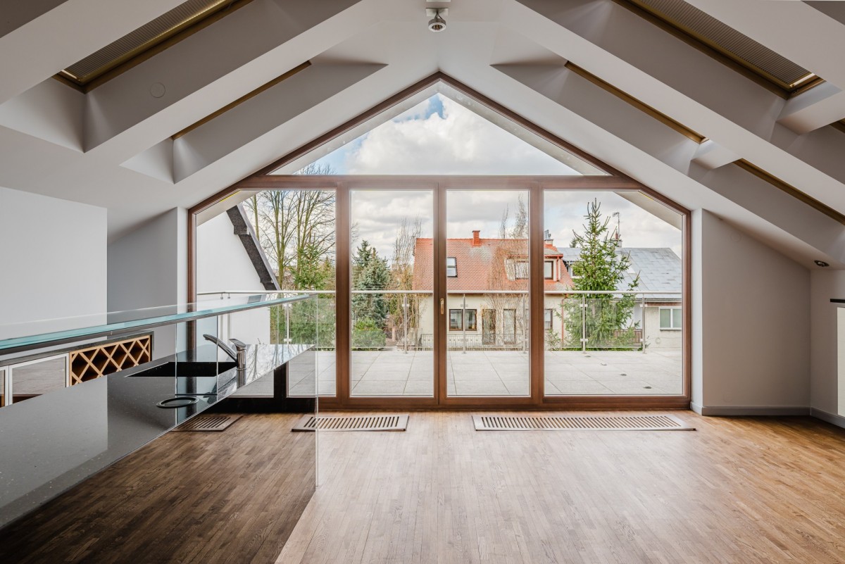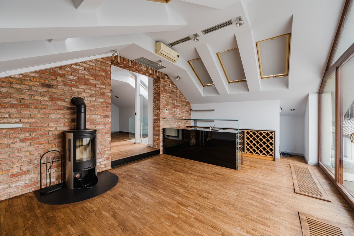 Poddasze to część rekreacyjna – open space z kominkiem, barem, tarasem oraz łazienką.