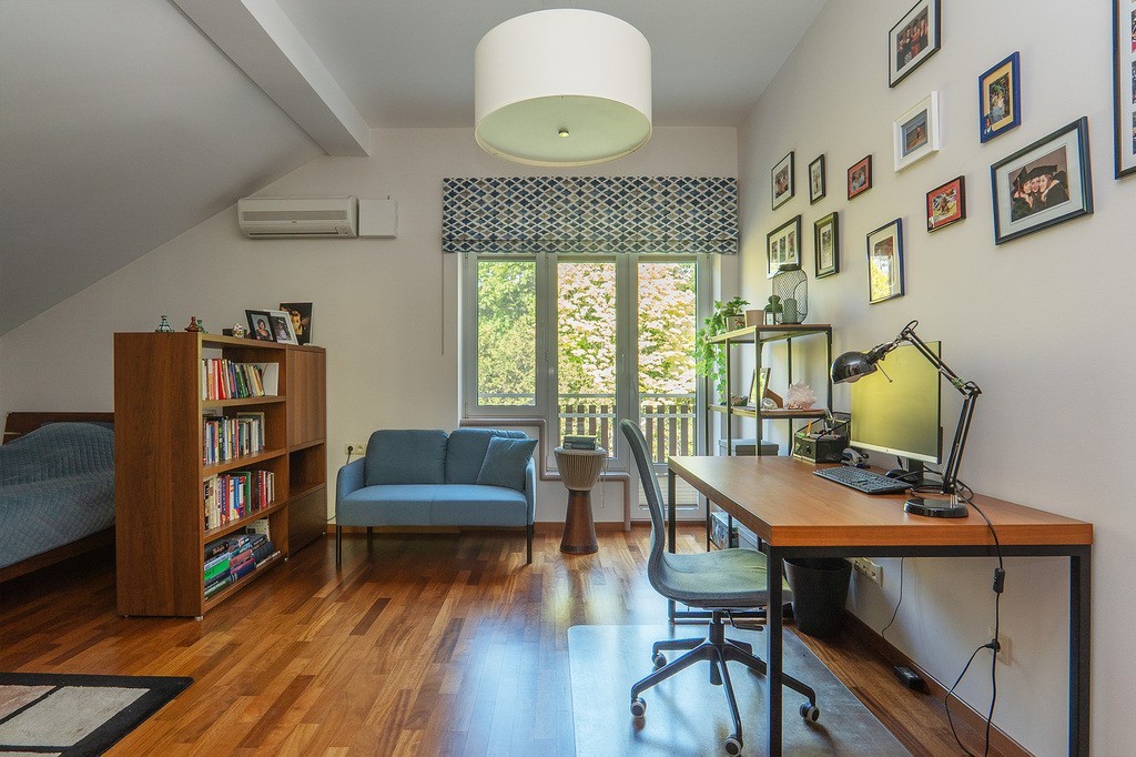 - Parter: salon z kominkiem i wyjściem na taras, jadalnia, kuchnia z AGD Siemens i lodówką Liebherr, gabinet (lub pokój seniora), WC, główna sypialnia z garderobą i pokojem kąpielowym.