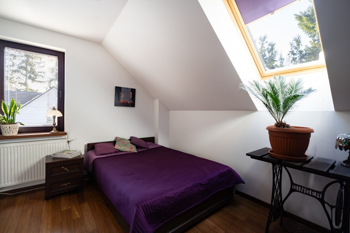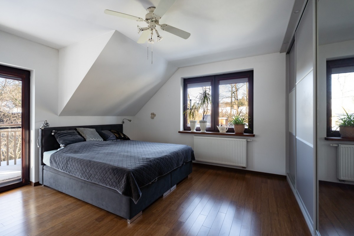Dom został zaprojektowany z myślą o komforcie życia i poczuciu „ciepłego domu”. W środku znajdziemy drewniane podłogi oraz schody, podgrzewaną terakotę i solidne wykończenie. Układ pięciu pokoi pozwala na wygodne zaaranżowanie przestronnego salonu, sypialni dla domowników oraz gabinetu do pracy lub pokoju gościnnego. Każdy znajdzie tutaj miejsce dla siebie. Dodatkowym atutem jest poddasze, które pełni funkcje gospodarczą. W salonie kominek buduje klimat i pełni funkcję dodatkowego źródła ogrzewania, a trzyszybowe okna poprawiają izolację i komfort termiczny. Na dachu panele słoneczne. Z domu wychodzimy na taras z widokiem na prywatny ogród.