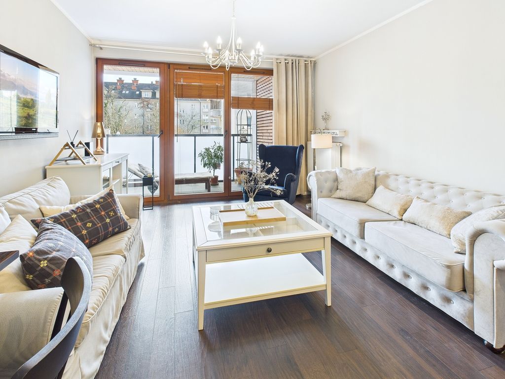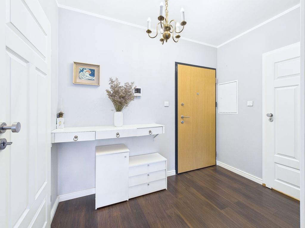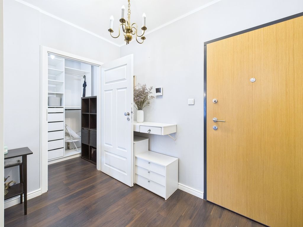 For rent, a sunny, fully furnished 57.20 m² apartment is located on the first floor of a modern building with an elevator in Warsaw’s Gocław district. This offer is aimed at discerning individuals seeking a move-in ready space that combines functionality with the warmth of home. The apartment boasts a well-thought-out layout and rare amenities, such as a separate dressing room and utility room, which definitively solve storage problems and improve the standard of everyday living.