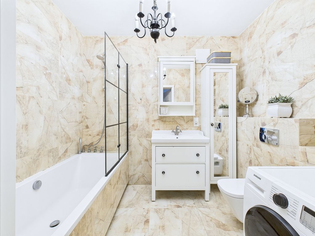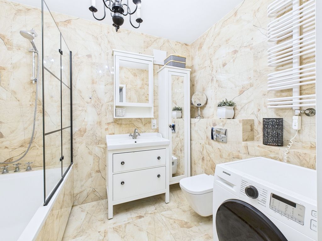 - Łazienka: z wanną z funkcją prysznica i pralką