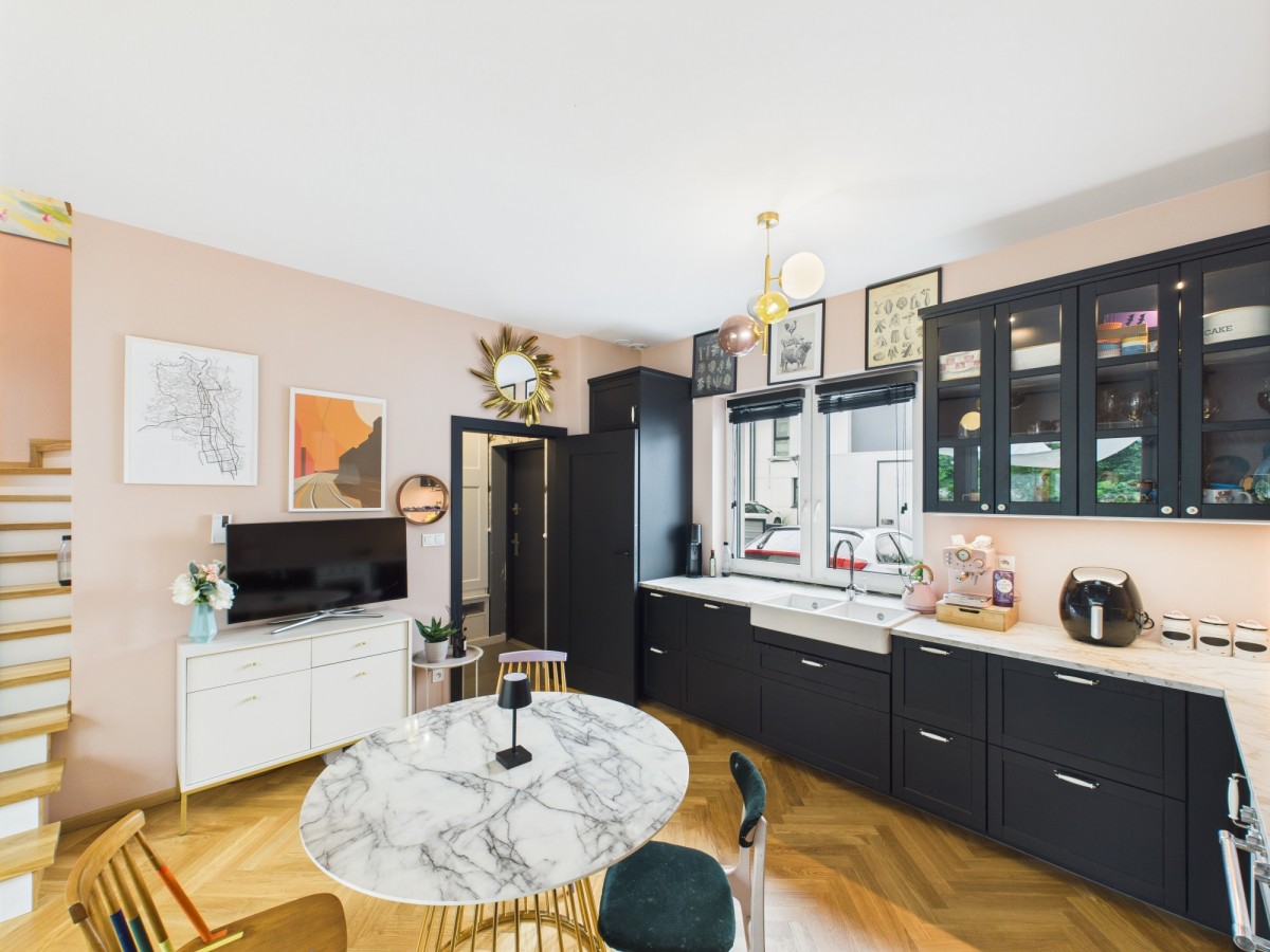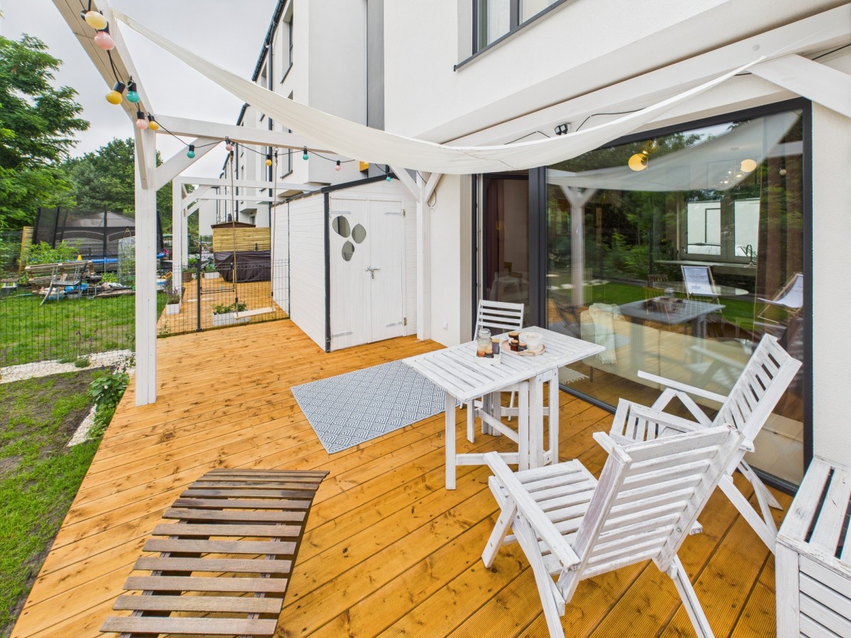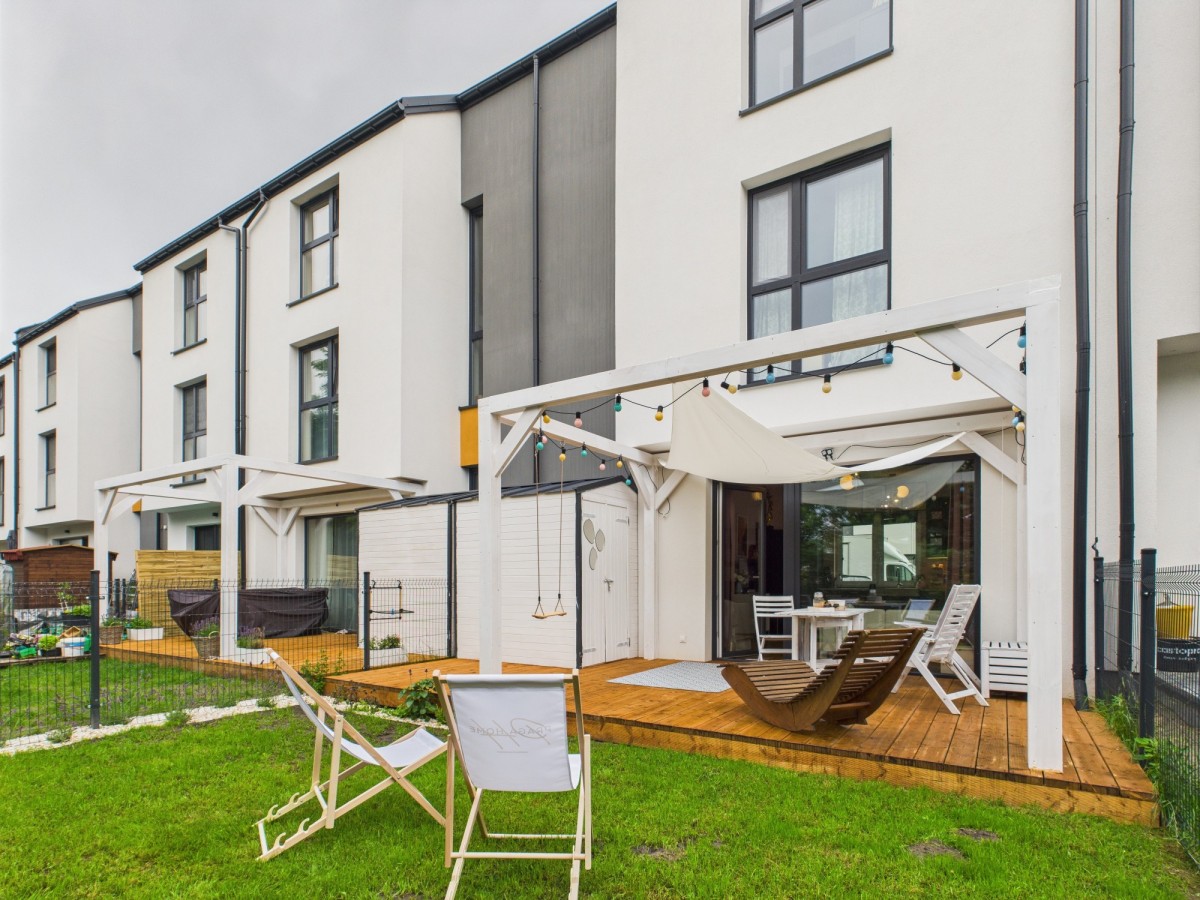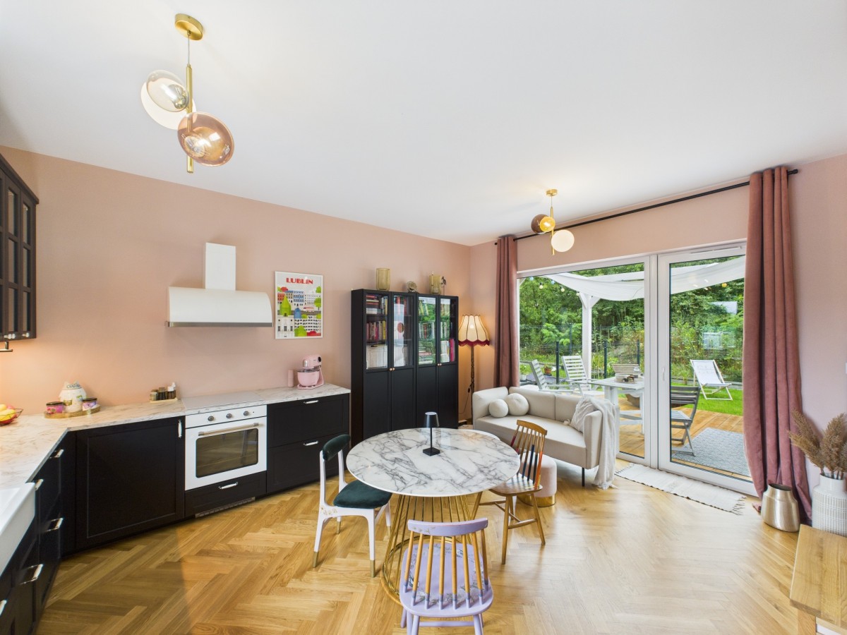 Na parterze znajduje się przestronny salon z dużym, funkcjonalnym aneksem kuchennym. Aneks oferuje dużo miejsca do przechowywania i pracy dla miłośników gotowania. Z salonu prowadzi wyjście na prywatny, ogrodzony ogródek w pełni zaaranżowany, z tarasem i pergolą — idealny do relaksu, grillowania czy zabawy z dziećmi.