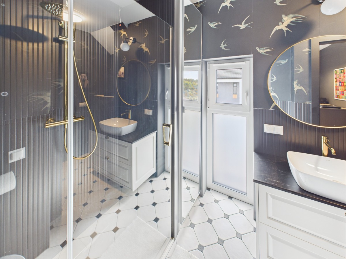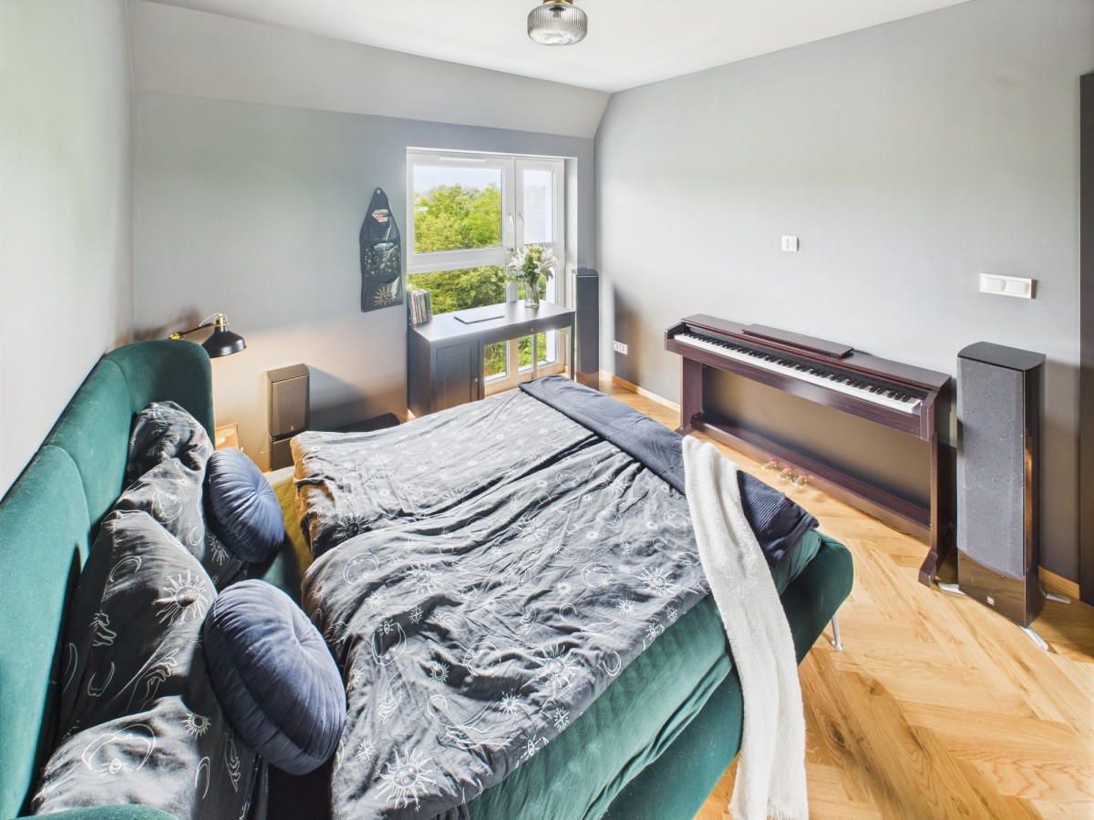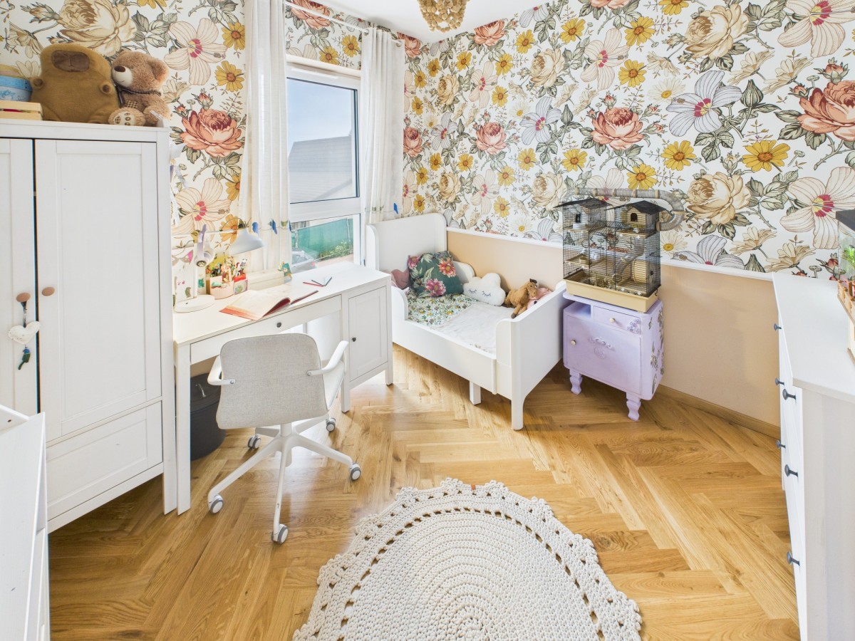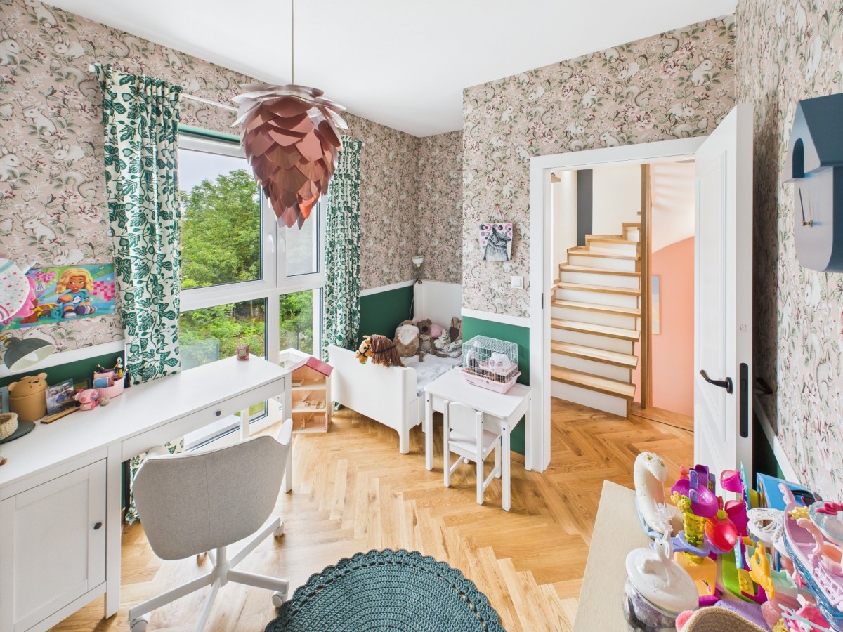 Na pierwszym piętrze rozmieszczono dwa pokoje dziecięce oraz łazienkę. Na drugim natomiast znajduje się przestronna sypialnia z garderobą i łazienką. Takie rozwiązanie sprawia, że dom oferuje trzy oddzielne sypialnie lub pokoje do pracy, co jest rzadkością w tej kategorii nieruchomości. Dodatkowo dostępne jest poddasze, które można zaaranżować według własnych potrzeb (np. jako przestrzeń do przechowywania sezonowych rzeczy). Schody zostały wykonane na wymiar z drewna dębowego.