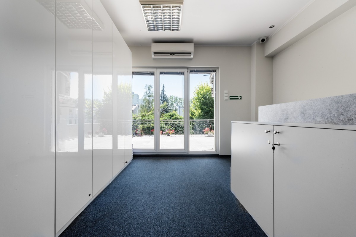 A charming and very green 200m2 plot with numerous plantings, rectangular shape, located in the depths of Sadyba. The segment located on it is currently prepared for business or residential purposes. It offers full office infrastructure, monitoring cameras and air conditioning on each floor. Carpets have been laid on the floors, and wooden boards underneath. The house has huge arrangement potential, a practical layout and a spacious terrace on the first floor. Thanks to the southern, eastern and western exposure, the property lets in a lot of natural light.