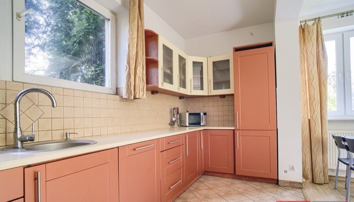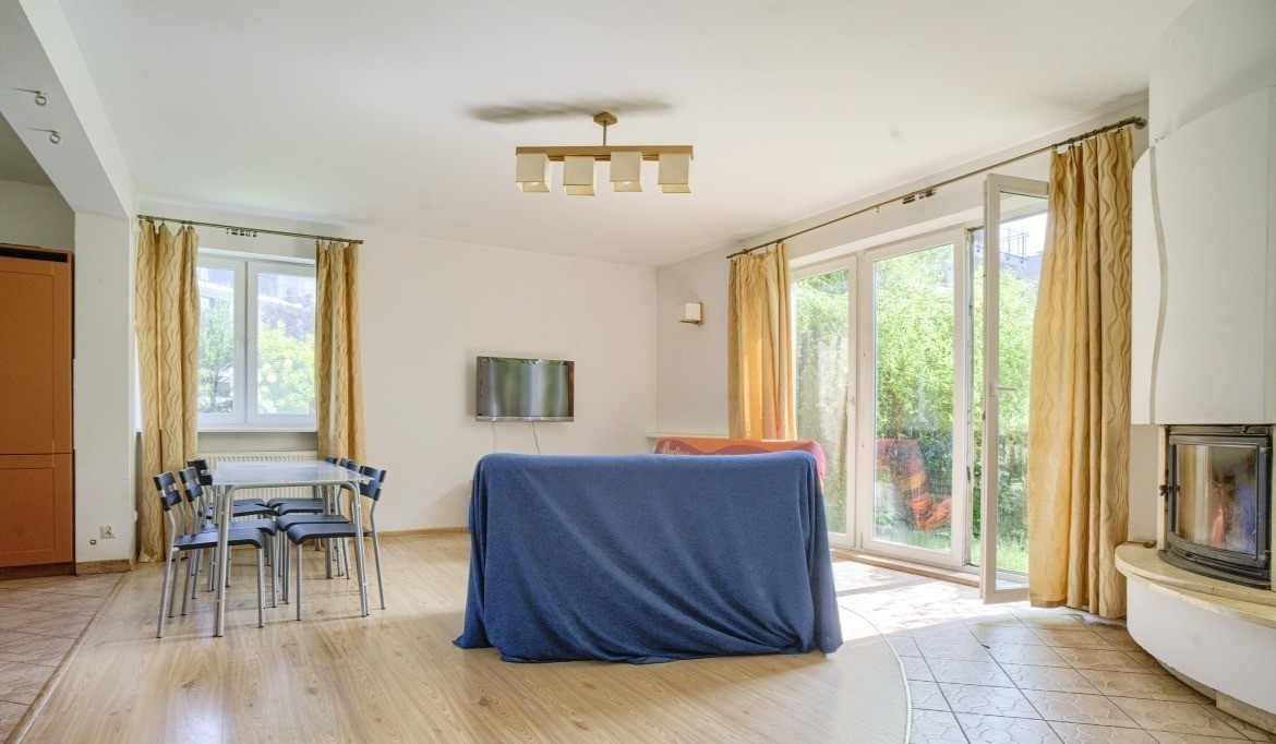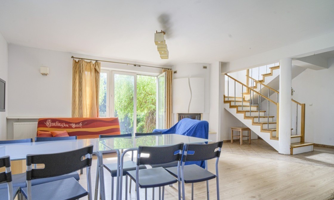 Na parterze jest salon z otwartą kuchnią, łazienka z prysznicem, garaż i pomieszczenie gospodarcze. Z salonu wychodzi się na ogródek, ok. 200 m2. Stoi tam grill i namiot służący jako altana.