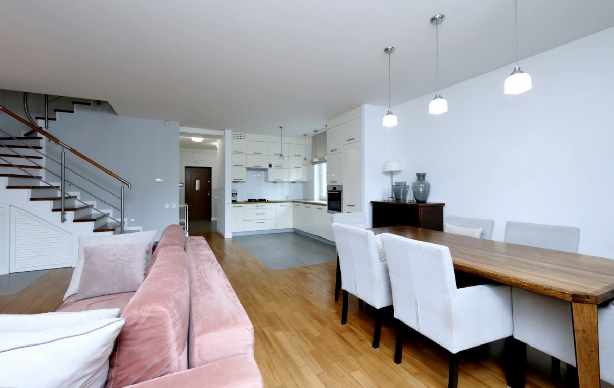 Na parterze znajduje się przestronny salon z aneksem kuchennym  z oknem (45,8m²) z bezpośrednim wyjściem do ogrodu od strony południowej.