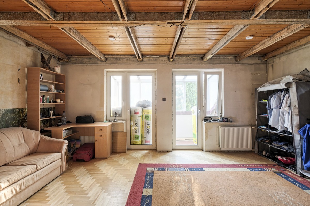 I piętro to dwa pokoje, jeden pełniący funkcje salonu z wyjściem na dużą loggię, sypialnia, łazienka i korytarz.