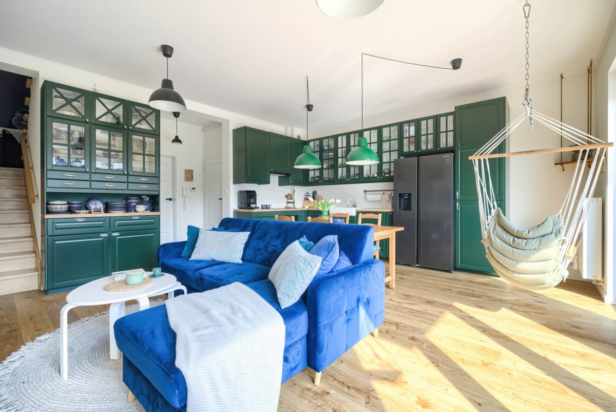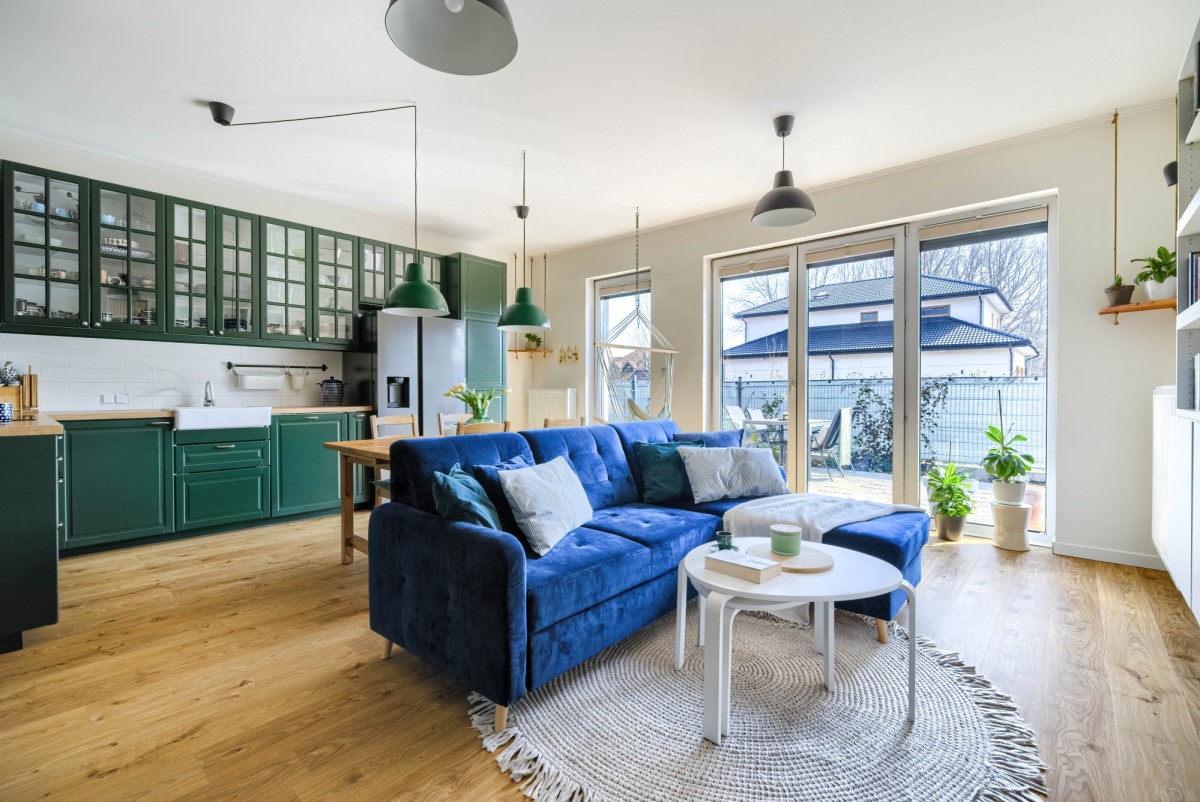 Centralną część domu stanowi jasny salon z dużymi przeszkleniami i bezpośrednim wyjściem na taras oraz zagospodarowany ogród. Naturalne podłogi i spójna zabudowa stolarska tworzą elegancką, harmonijną przestrzeń dzienną.