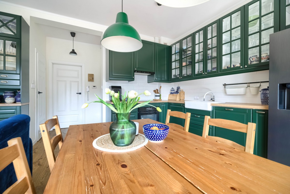 zmywarkę, płytę indukcyjną, piekarnik, okap oraz lodówkę dwudrzwiową z kostkarką i filtrowaną wodą. Dodatkowym atutem jest kredens oraz oświetlenie meblowe.