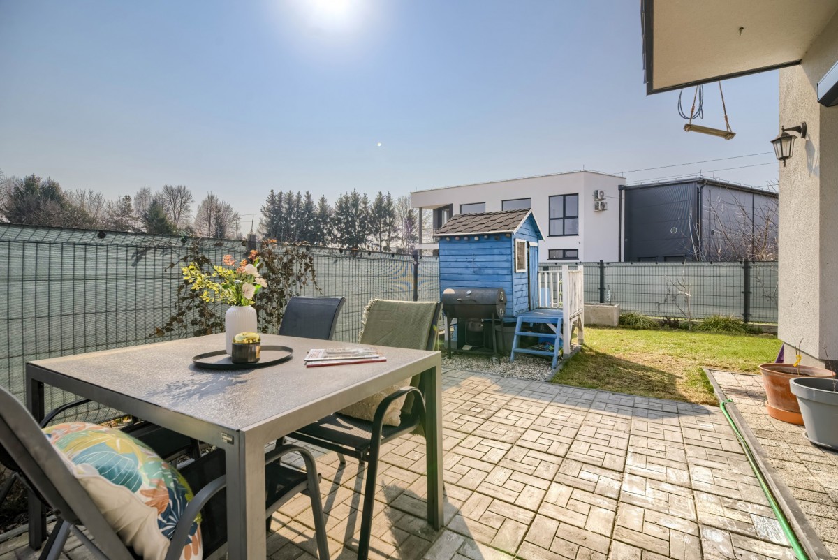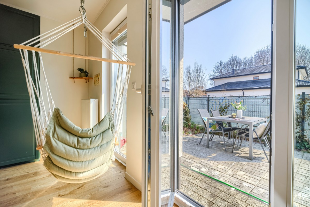 Z salonu prowadzi wyjście na taras wyłożony kostką brukową oraz zadbany ogród z nasadzeniami.