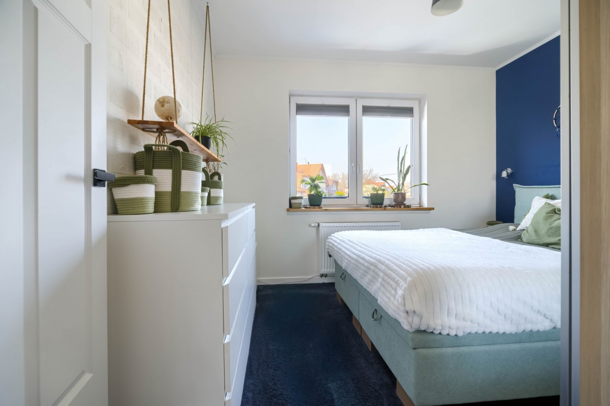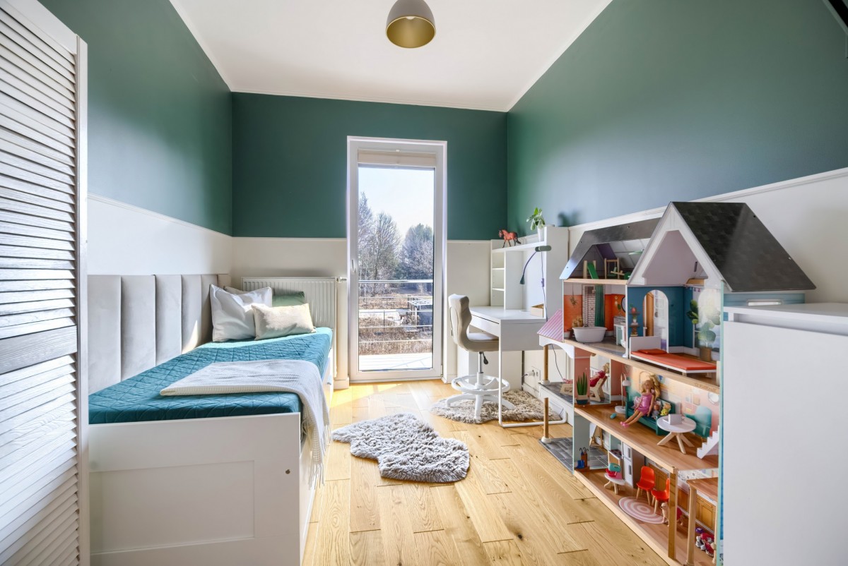 Na piętrze zaprojektowano trzy ustawne sypialnie, w tym dwie z wyjściem na balkon od strony ogrodu. Łazienka wyposażona została w prysznic typu walk-in z odpływem liniowym oraz zabudowę meblową. Na podłogach naturalna deska.