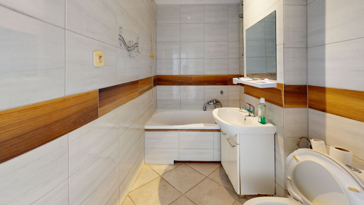 Przedpokój: Wyposażony w pojemną zabudowę, w której ukryto pralkę (pełne przyłącze wodno-kanalizacyjne). To niezwykle wygodne rozwiązanie, które oszczędza miejsce w łazience i zapewnia pełen komfort podczas kąpieli.