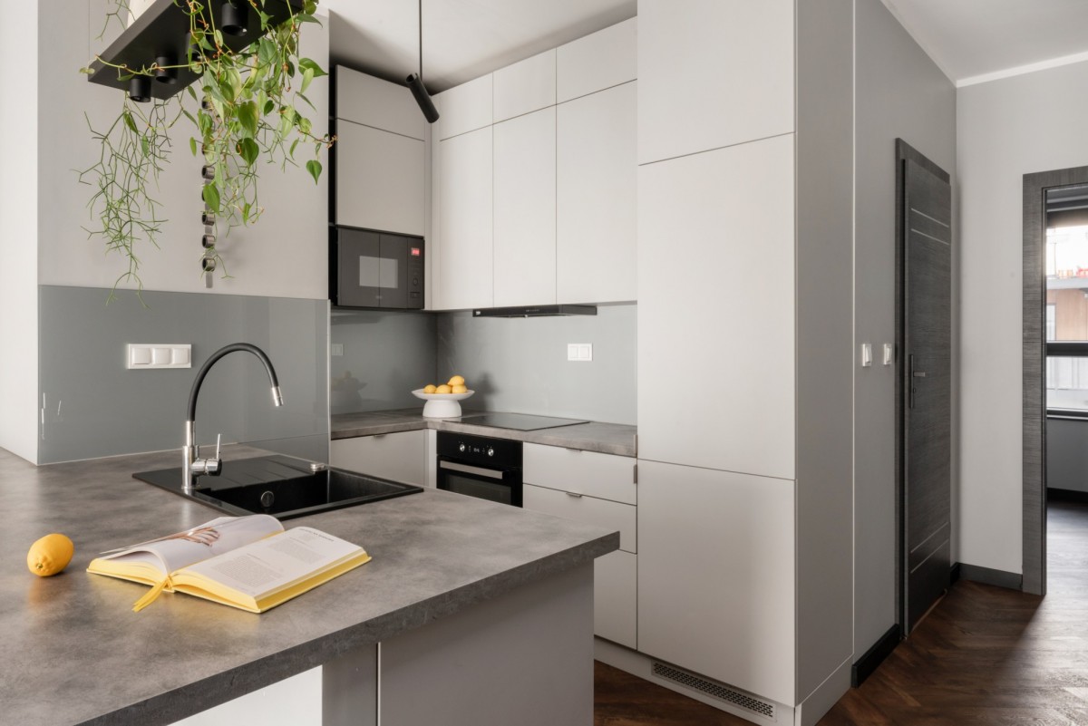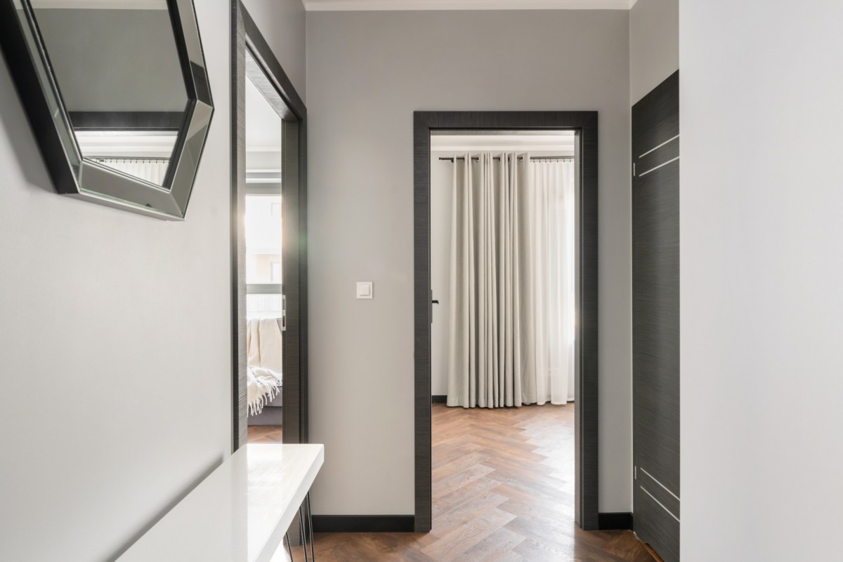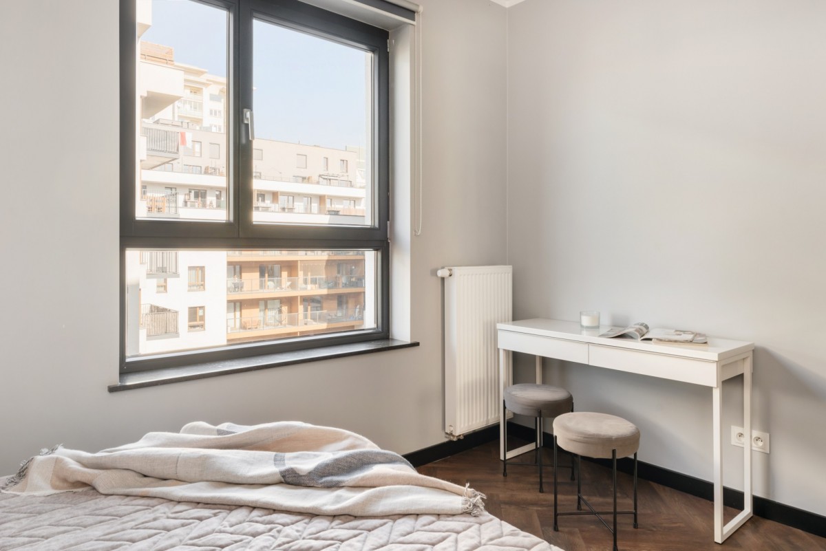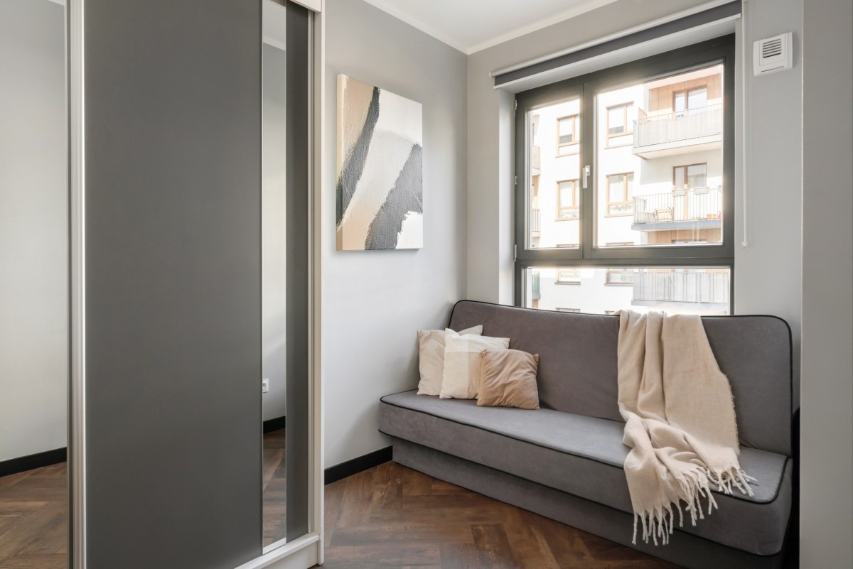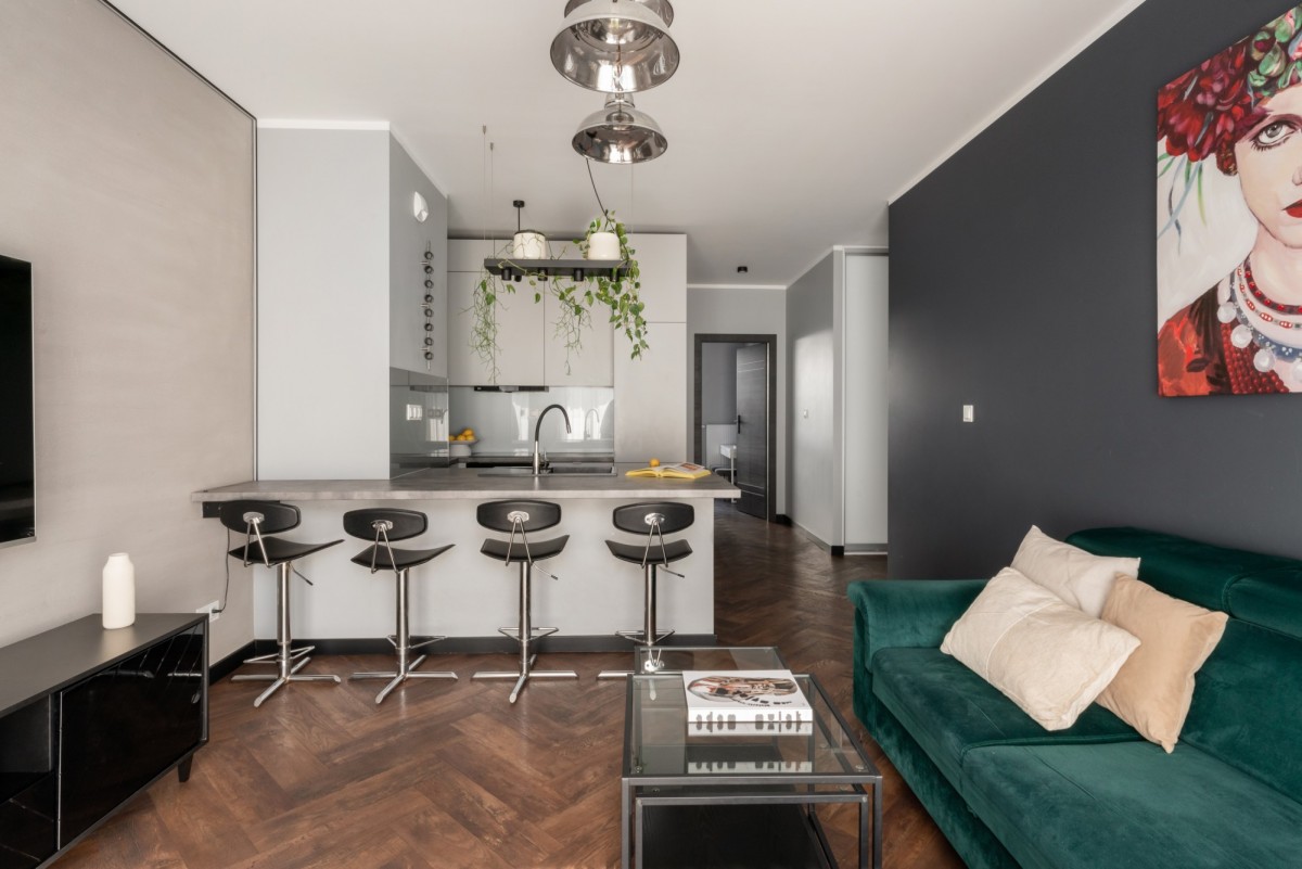 Apartament jest w pełni umeblowany i wyposażony, gotowy do zamieszkania. Wnętrze zostało zaprojektowane w spójny i funkcjonalny sposób, oferując dużą ilość miejsca do przechowywania, w tym pojemną szafę w przedpokoju.