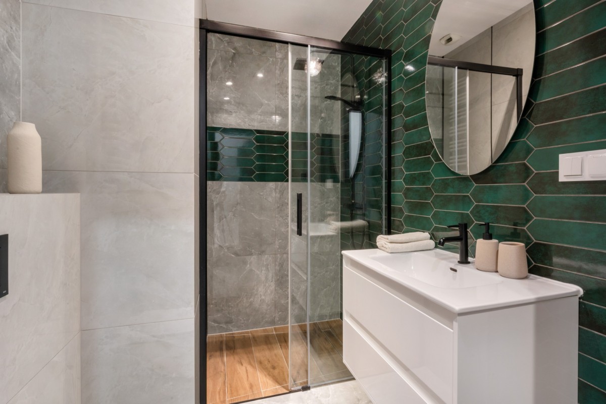 Strefa prywatna obejmuje trzy ustawne sypialnie z ekspozycją wschodnią, co gwarantuje przyjemne poranne światło. W mieszkaniu znajdują się również dwie łazienki z prysznicami, co znacząco podnosi komfort codziennego użytkowania.