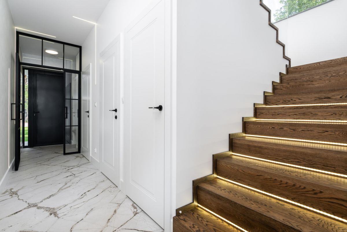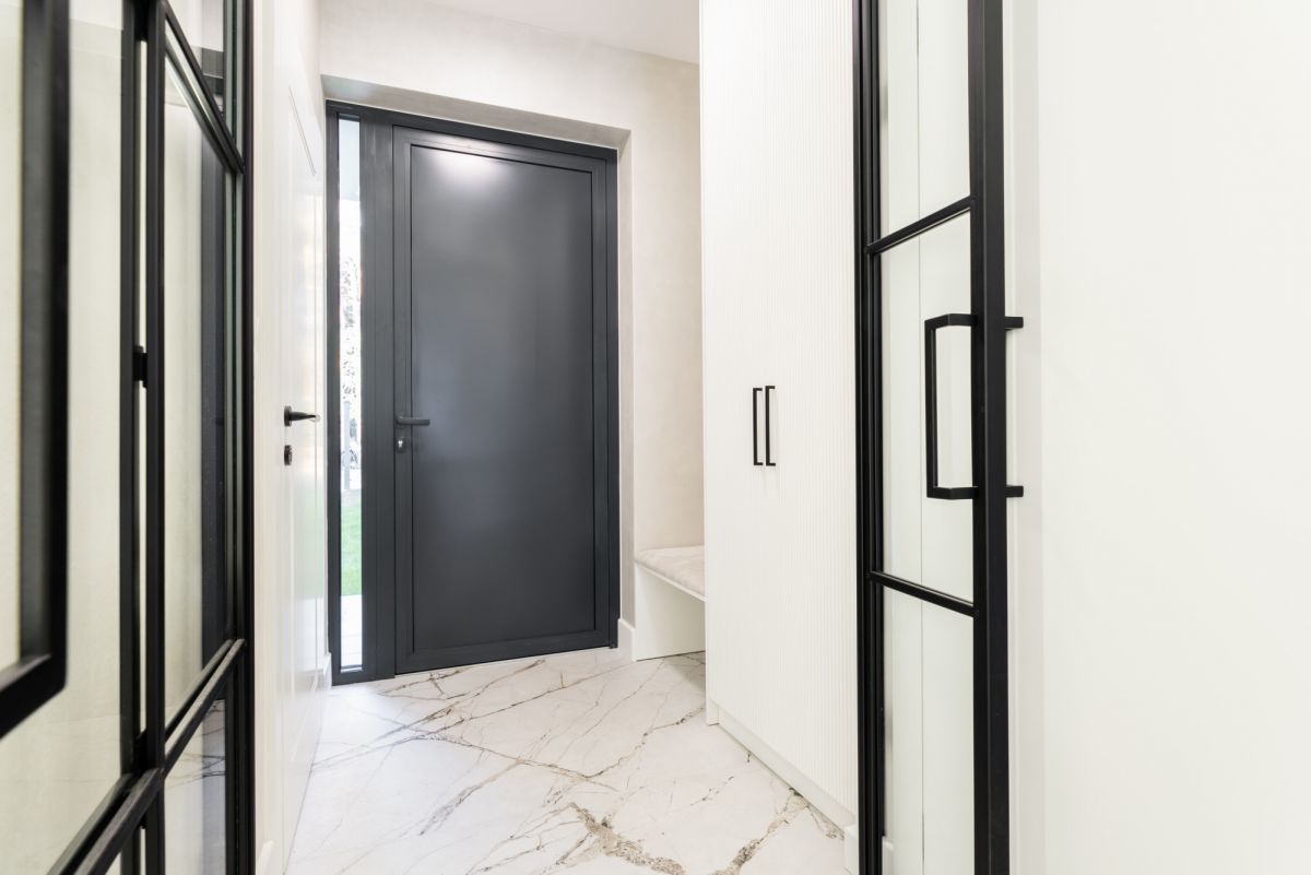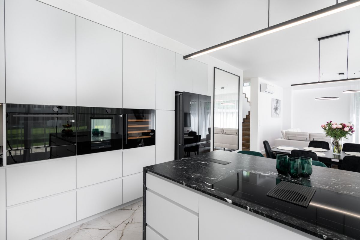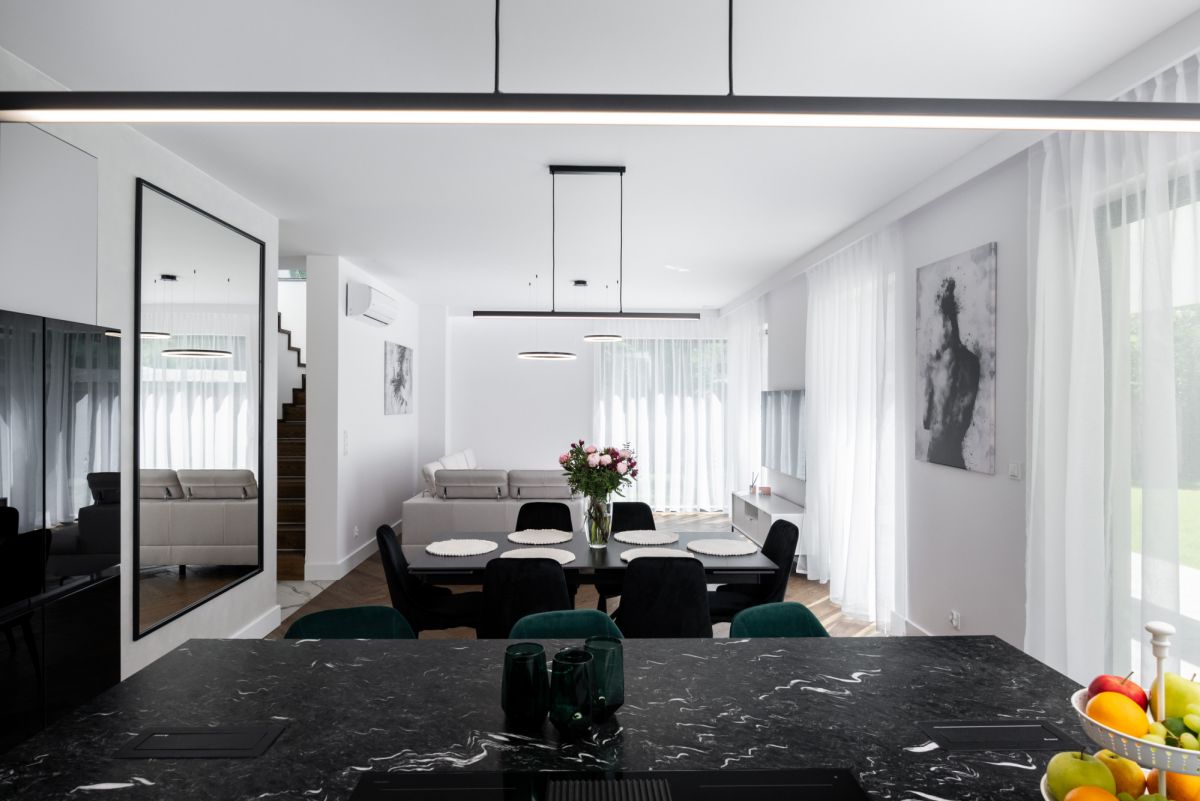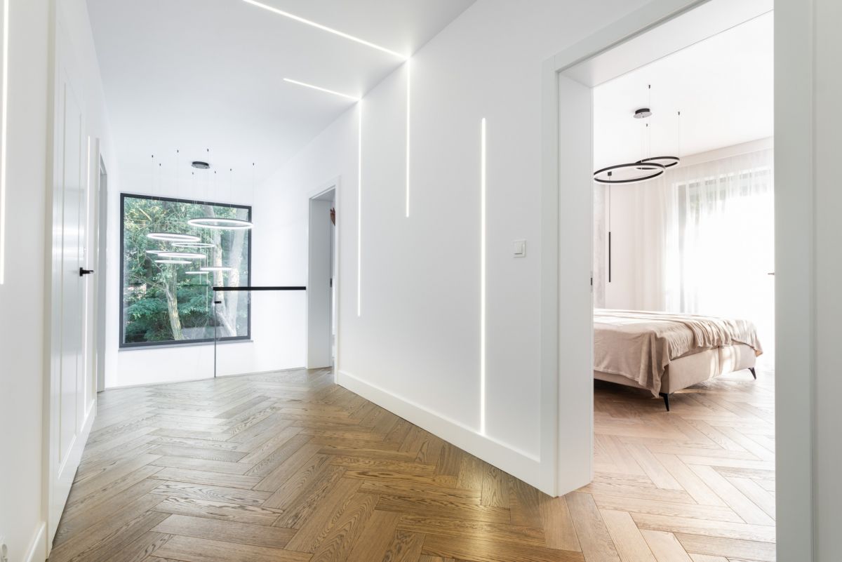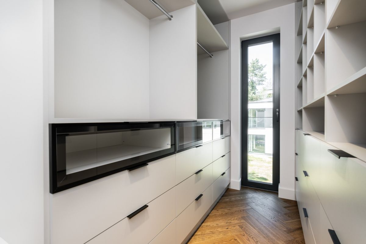 Dom wykończono w standardzie premium: dębowe podłogi ułożone w jodełkę, aluminiowa stolarka okienna, przesuwne systemy HS, kuchnia i zabudowy wykonane na wymiar, sprzęt AGD najwyższej klasy, wielkoformatowe gresy, granit oraz beton strukturalny. W salonie oraz sypialni master zainstalowano klimatyzację i telewizory.
